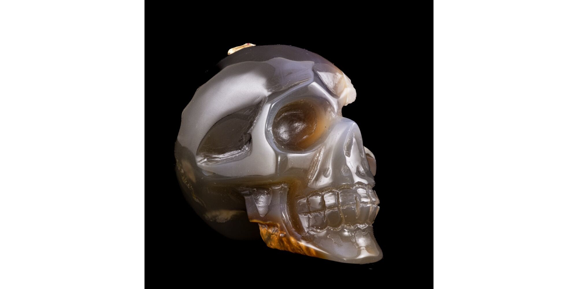 Carved gray agate skull with a gilded silver snake, its head adorned with 1 larger, cabochon-cut almandine and 2 smaller almandines. Dimensions: 7 x 9 x 5 cm. End of the 20th century.