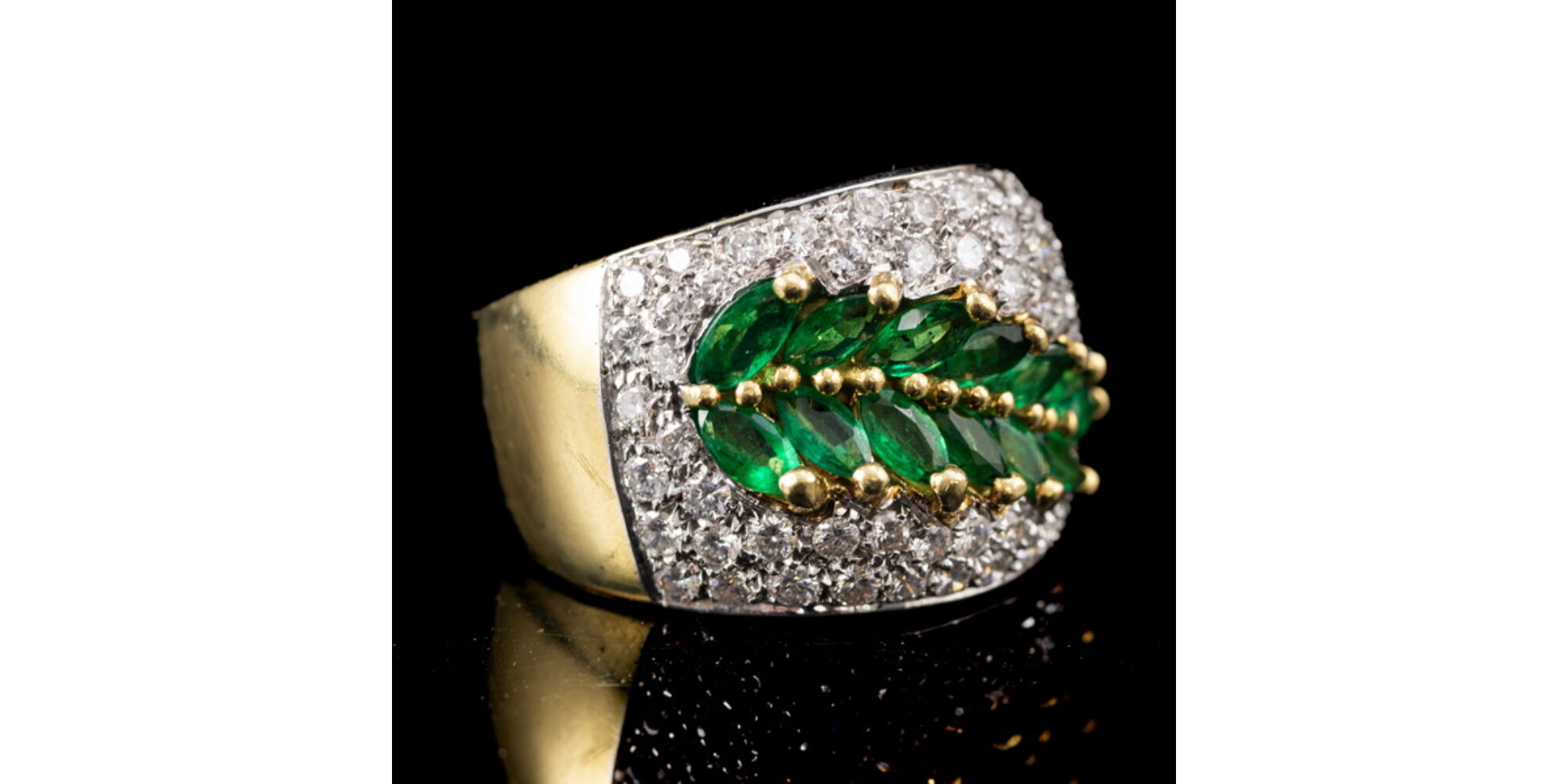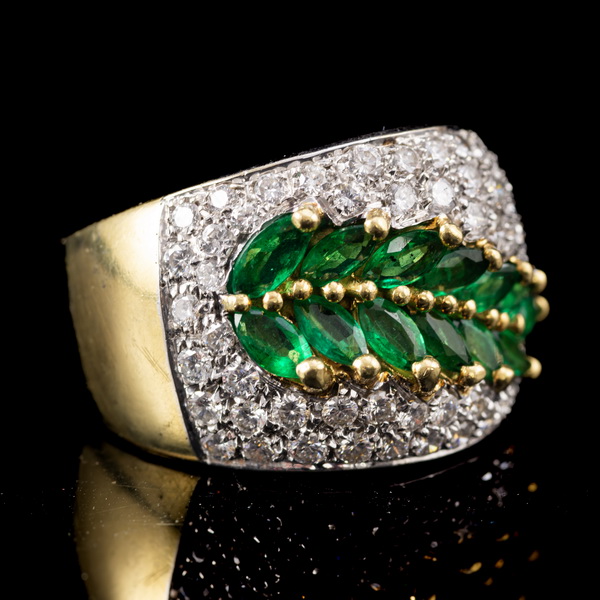 18 karátos arany gyűrűsín, bruttó tömege: 19,2 gramm. Kiszélesedő gyűrűfejben középen sárgaarany karmokkal foglalt 13 navett csiszolású smaragd Cca. 2,6 ct; körülöttük fehérarannyal foglalt 59 modern briliáns csiszolású gyémánt Cca.2,3 ct (M1; TCr; VVs-Vs) Jelzett: 750-es finomságjelzéssel és 1968-tól használt (Alessandria) olasz fémjellel.