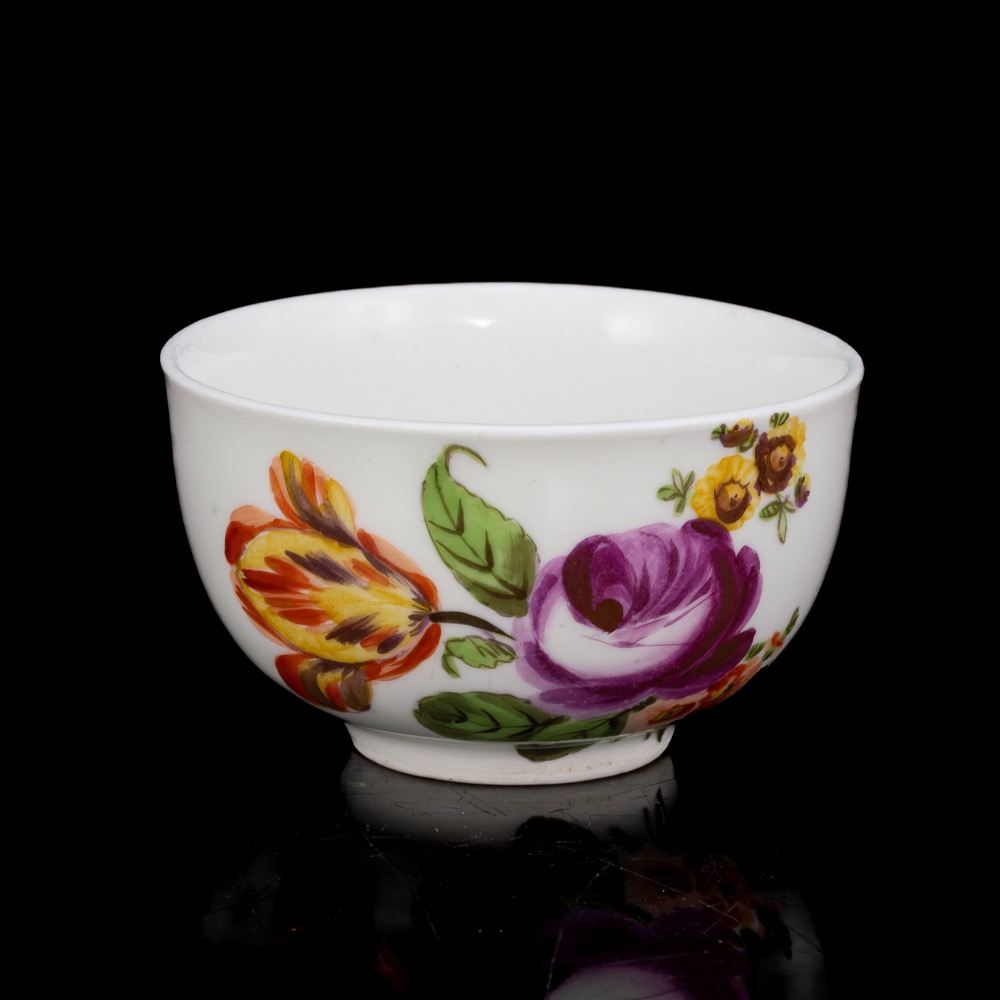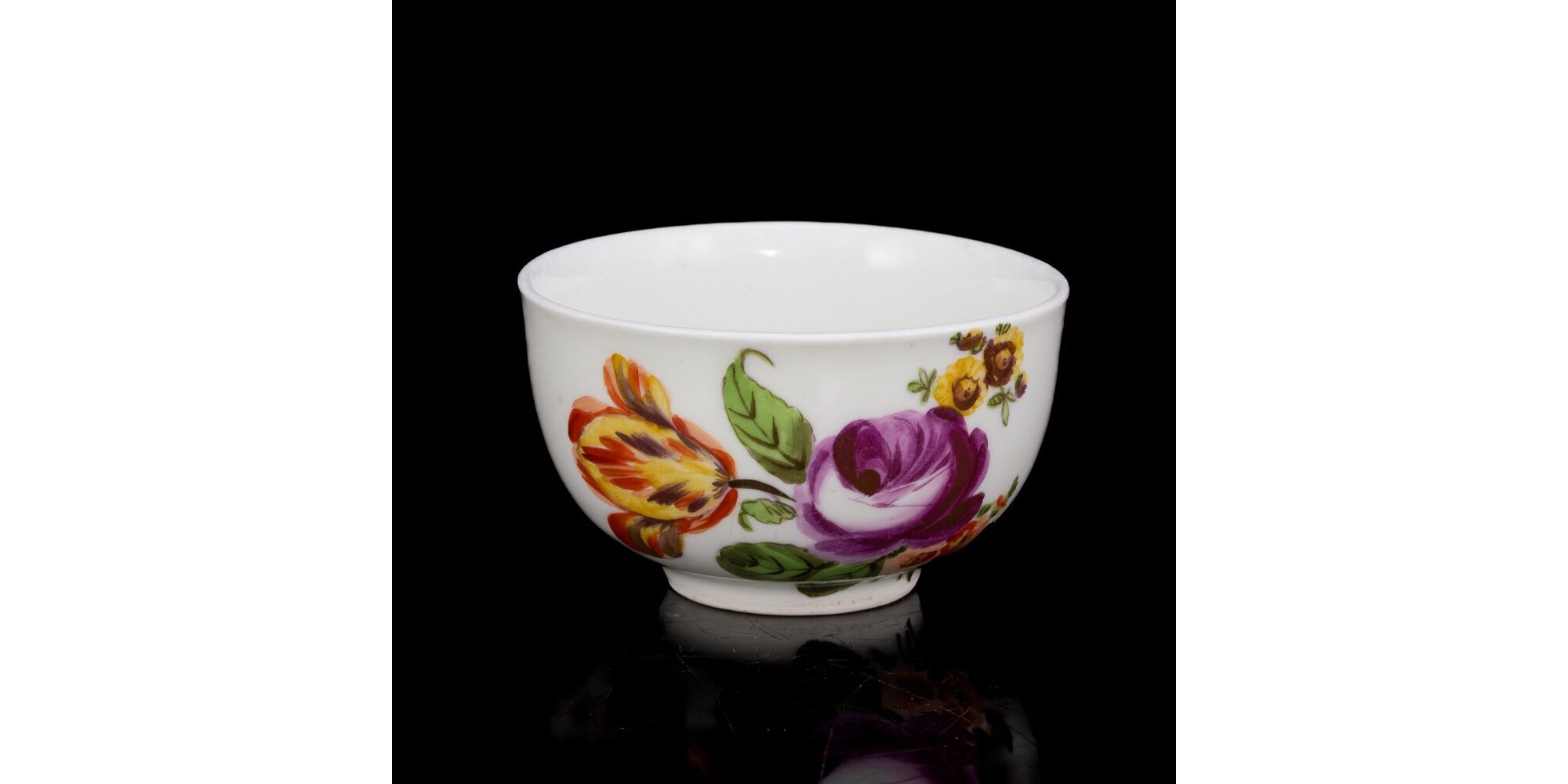 Virág dekorral festett, mázas porcelán csésze, méretei: 4,5 x d:7,5 cm. Jelzett: máz alatt kék festett Alt Wien jelzéssel, masszába nyomott 67 formaszámmal.