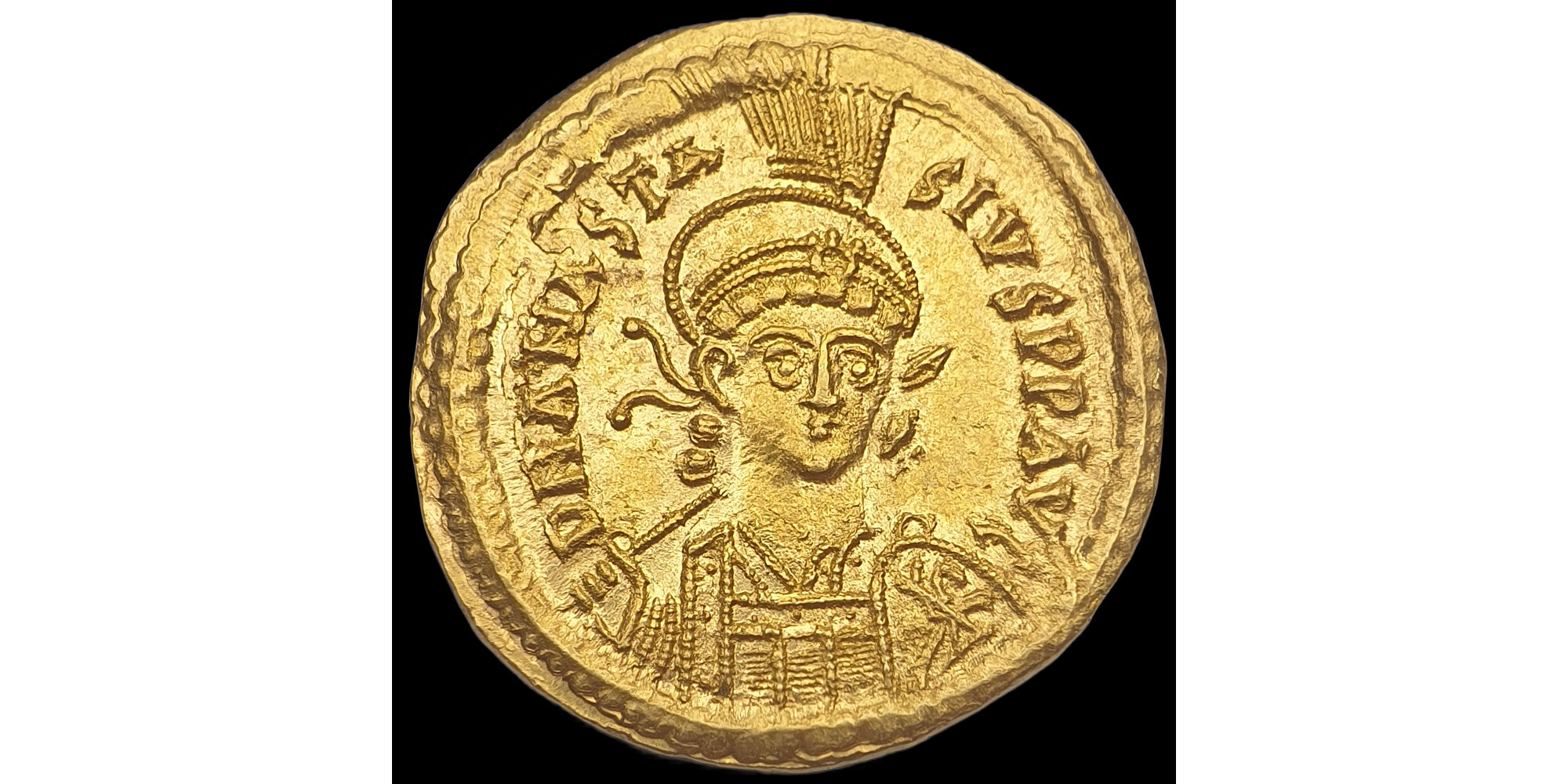Előlap: D N ANASTASIVS P P AVG (Császár sisakos, páncélos jobbra néző portréja, jobb vállán lándzsa, bal karján pajzs)
