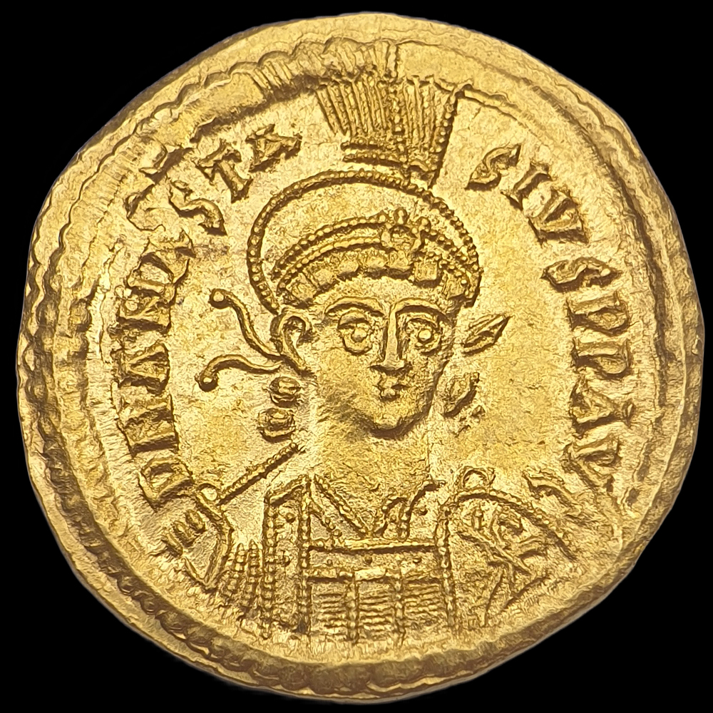 Anastasius bizánci császár (Kr.u. 491-518) arany solidus. Konstantinápoly, Kr.u. 492-507 között (10. officina). Hátoldalán kis karc. Tömege: 4.5 gramm. Átmérője: 20 mm. EF!