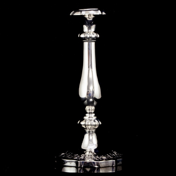Kézzel trébelt kerek talpról felhúzott, 13 latos antik ezüst gyertyatartó, nódusszal tagolt szárral. Nettó tömege: 228 gramm. Méretei: 24,5 x d:11,5 cm. Jelzett: 1847-es antik bécsi fémjellel.