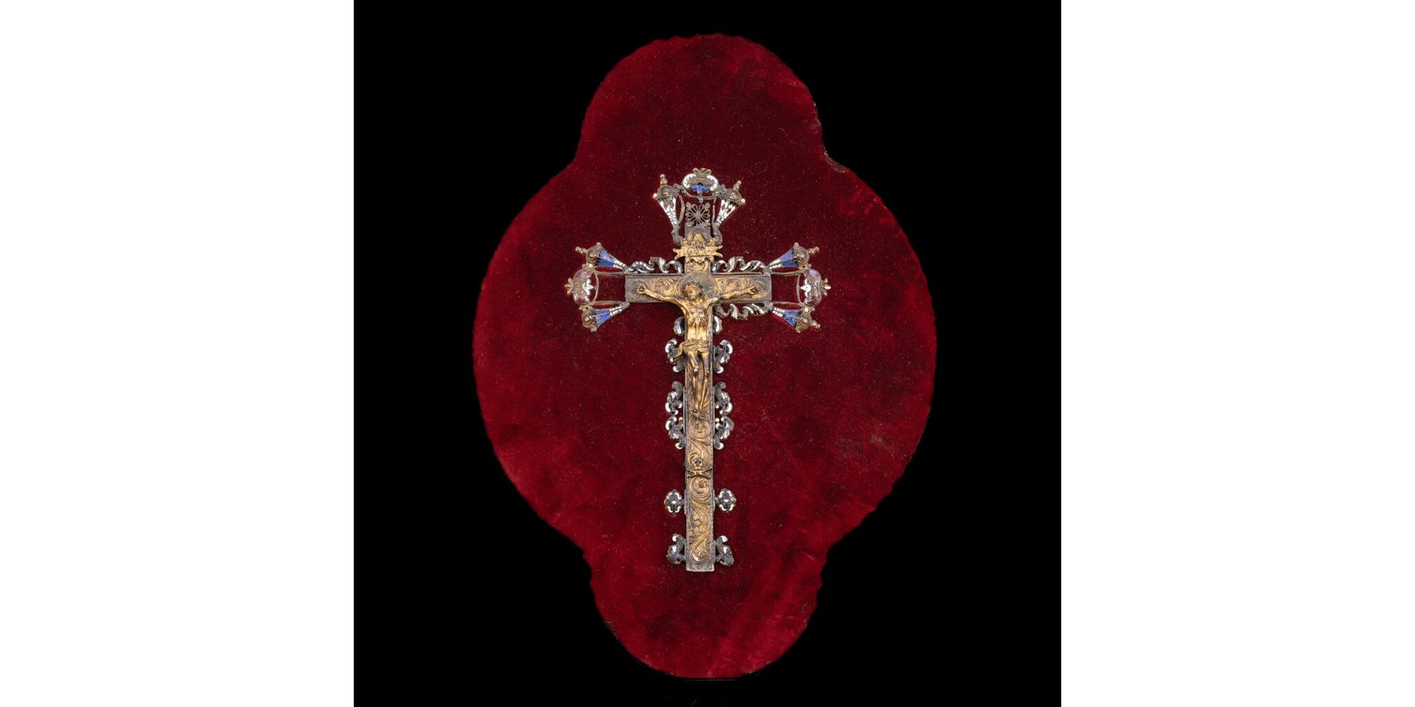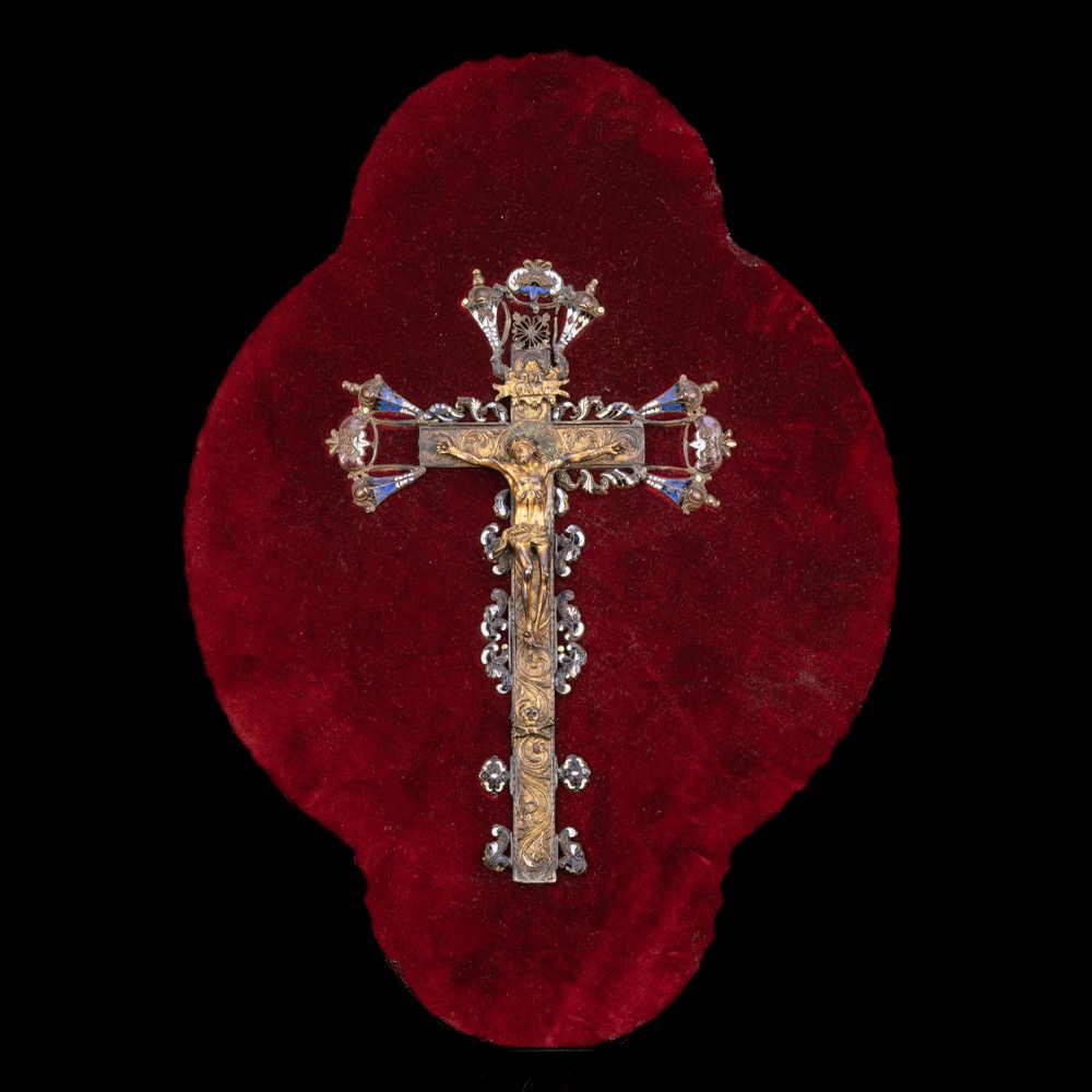 Aranyozott bronz kereszt megfeszített Krisztus corpussal, színes zománc díszítéssel. XVIII. század vége, feltehetően olasz vagy francia. A díszítő elemek hiányosak, a zománc sok helyen sérült, javított, a corpus bal keze szintén restaurált. Vörös, bársony borítású hátlapra rögzítve. Mérete: 23.5 x 15.5 cm.