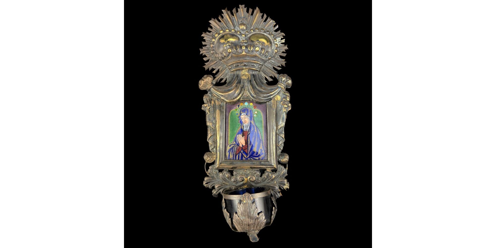 Gilded, pressed silver holy water vessel, dimensions: 35 x 10 x 6 cm. Self-colored cobalt blue glass water vessel, framed with pressed acanthus leaves. Above the vessel there is a depiction of the Madonna on a copper plate, made using the Limoges enamel technique. Presumably Spanish or French, late 19th century-early 20th century. Unmarked.