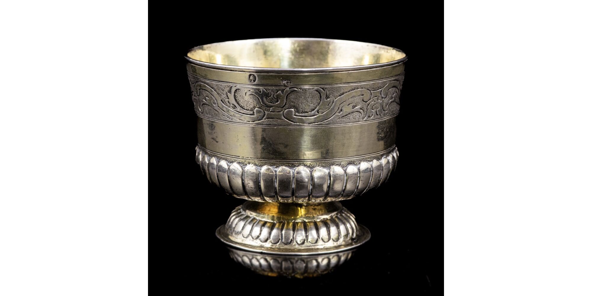 Karéjokkal tagolt kerek talpas antik ezüst pohár, kívül-belül tüziaranyozott felülettel. Méretei: 66 x d:77 mm. Nettó tömege: 135,7 gramm. Jelzett: 1700-as évek, Augsburgi fémjellel valamint Philipp Johann Gross mesterjegyével, továbbá 1806-1809 között használt bécsi adómentesítőjellel. Külső felületén az aranyozás megkopott.