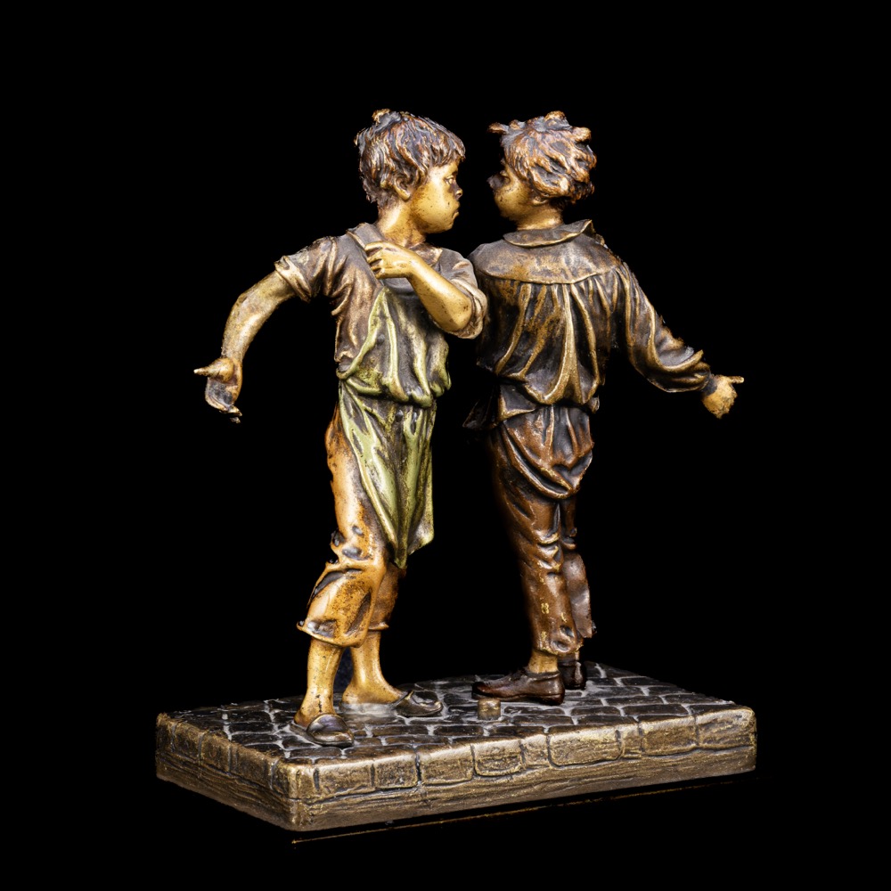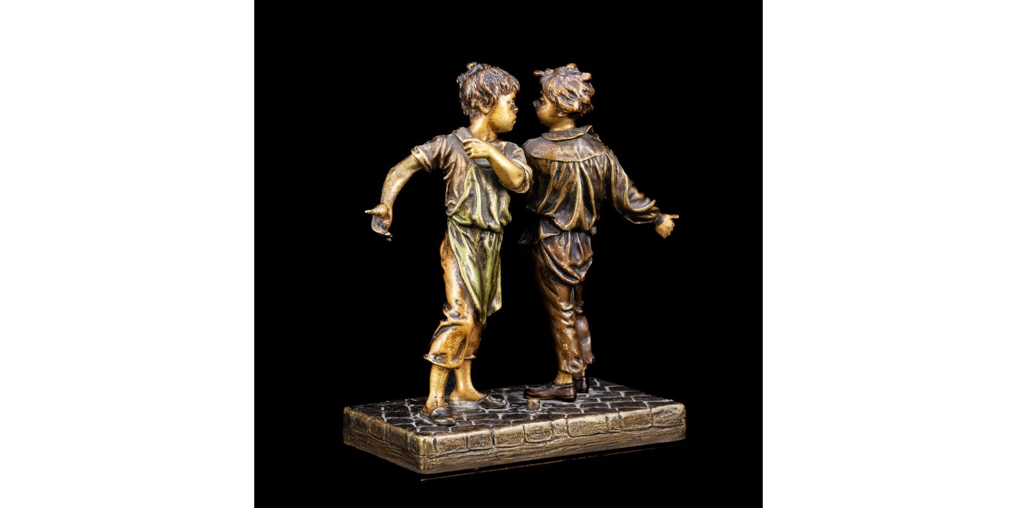 Négyszögletes talapzaton, öntött, festett bécsi bronz, egymással nézeteltérésbe keveredett fiúk alakjával készült, cselédhívó csengő, amely elektromos szerelékektől megfosztott állapotban. Méretei: 14,5 x 13 x 7 cm. Jelzett: talplemezébe benyomott Bergmann készítőjelzéssel. Ausztria, Bécs 1900-as évek eleje.