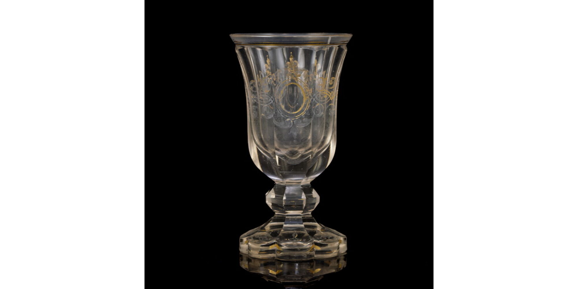 Colorless in itself, on a segmented round base with a nodular stem, with a bell-shaped cup. Peeled, gold-painted glass, with heavily worn paint. With a 1 cm crack on the edge of the cup. A.M. engraved monogram in one of the two painted coat of arms. Dimensions: 15.5 x d:8.5 cm. Presumably Austrian or German, mid-19th century.