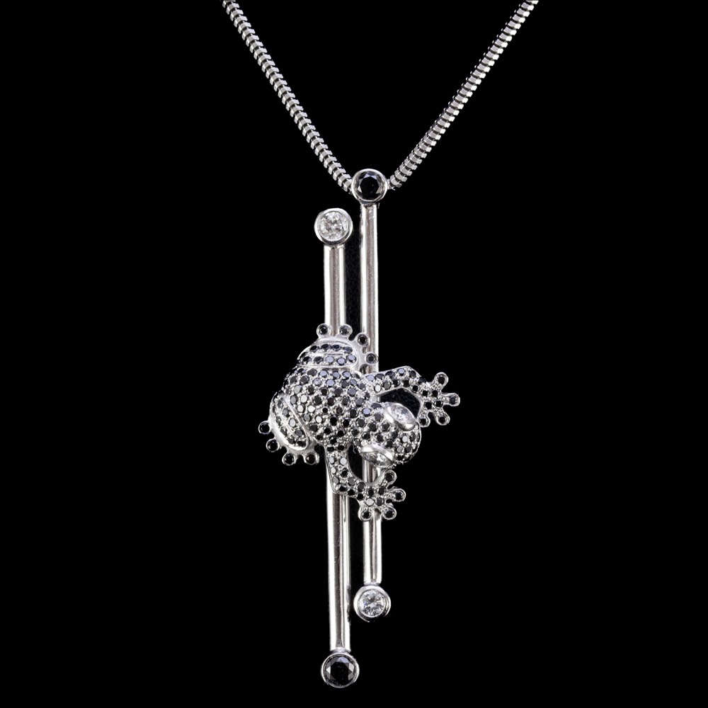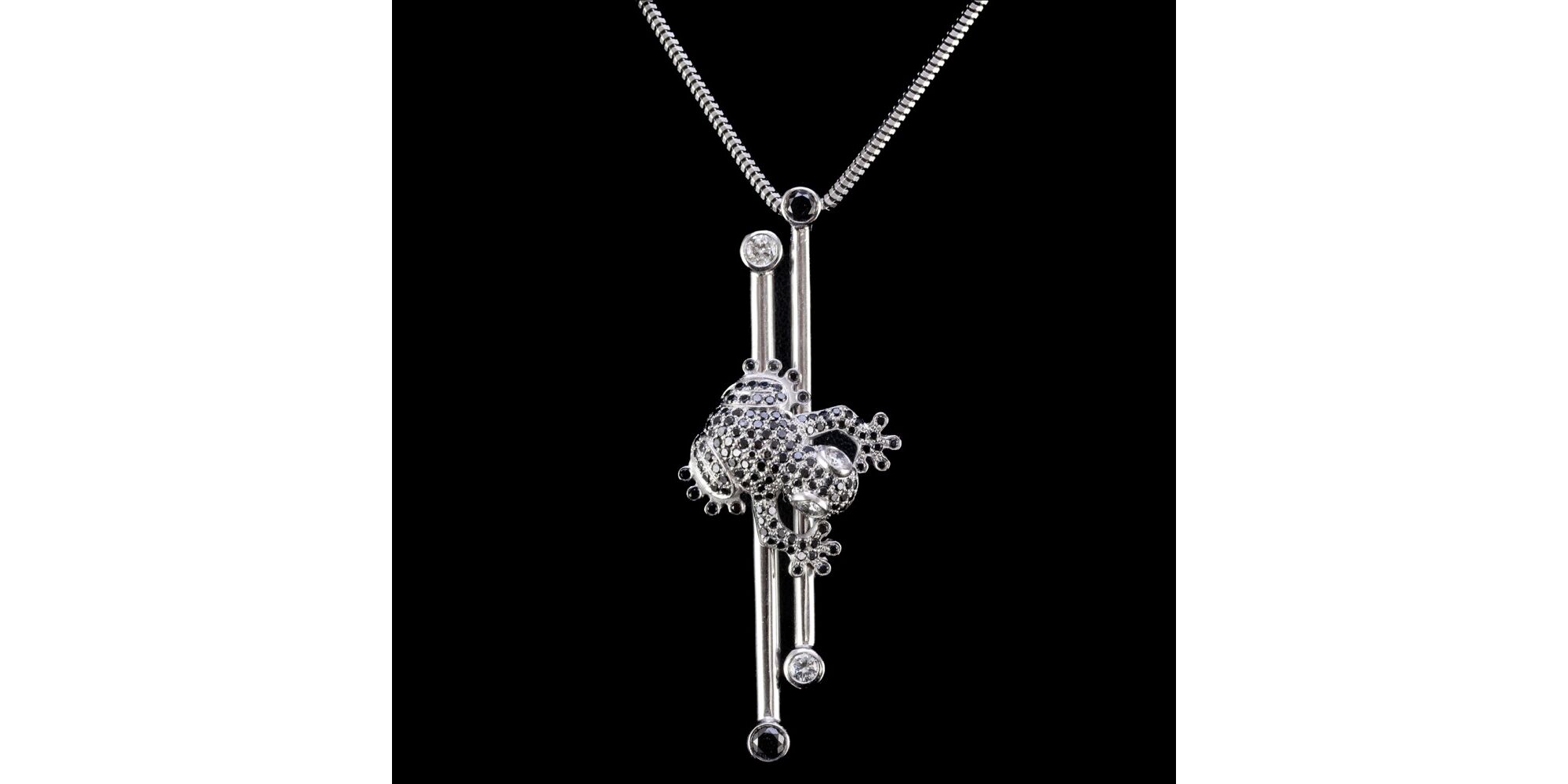 14 karátos modern fazonú arany nyaklánc (hossza:45 cm) Nettó tömege: 6 gramm. Függő: egymással párhuzamosan futó pálcákon apró, kerek formára csiszolt fekete gyémánt ékített béka figura. 154 apró fekete gyémánt mindösszesen: Cca.0,77 ct. Pálcák végein arannyal lemezelt foglalatban 1-1 fekete gyémánt Cca.0,30ct. és 2-2 szintelen briliáns csiszolású gyémánt Cca.0,60 ct. (M1;W;VS). Jelzett nyaklánc: 2006-2016 között használt magyar fémjellel.