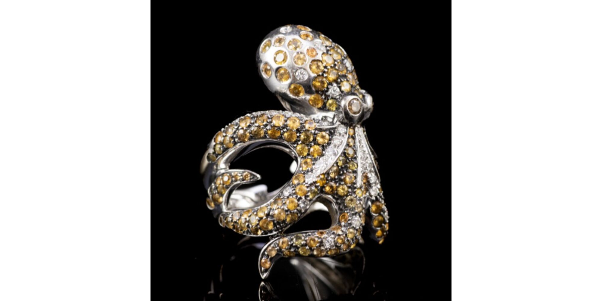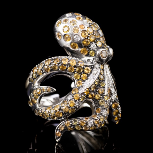 Modern olasz Design gyűrű kövekkel kirakott polipos gyűrűfejjel. 18 karátos fehérarany, Bruttó tömege:26,88 gramm. 184 foglalt sárga zafírral Cca.6,5 ct; és 45 modern briliáns csiszolású gyémánt ékítéssel Cca.1,45 ct. Jelzett: 1968-tól napjainkig használatban lévő olasz fémjellel. Gyűrű mérete: 60.
