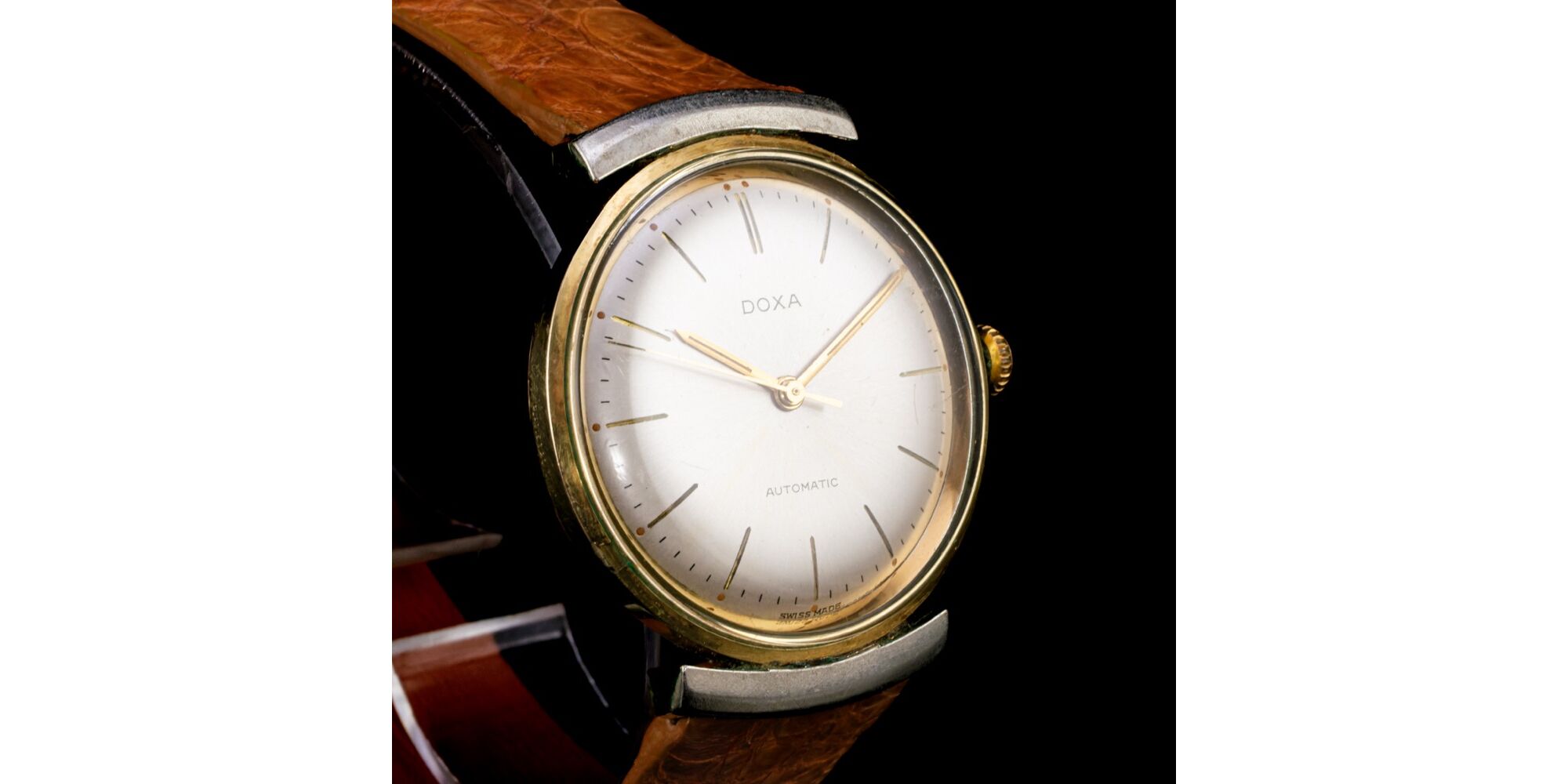 Aranyozott acéltokban automata szerkezet, aranyozott indexes, percbeosztásos számlap centrál mutatókkal. Tok mérete: 34 mm. Jelzett Tok, Számlap, Szerkezet: Doxa; 6430316;11558 7 tokszámmal. Svájc, 1960-70 körül. Működik. Cserélt, új bőrszíjjal.