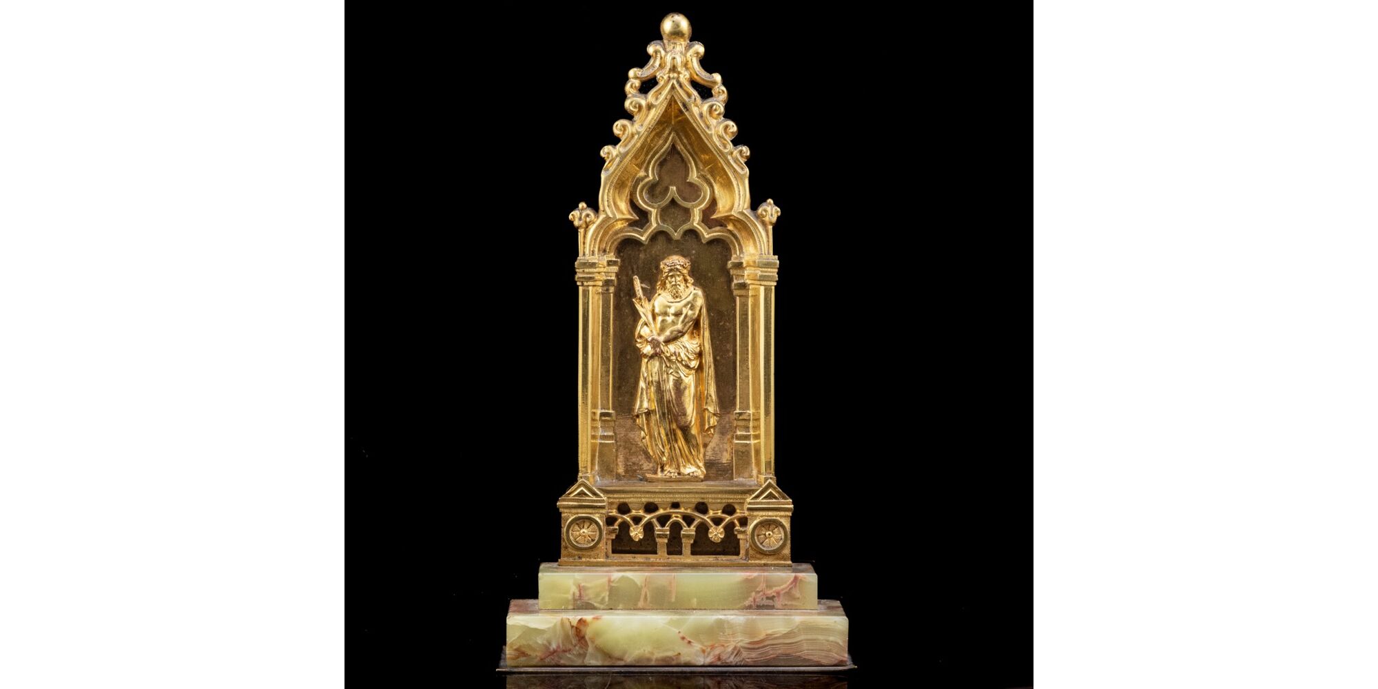 Gothic style, fire-gilded copper alloy frame with a plastically shaped full-length figure of Christ, on a stepped green onyx pedestal. Overall size: 27 x 14.5 x 5.7 cm. Unmarked. Mid-19th century.