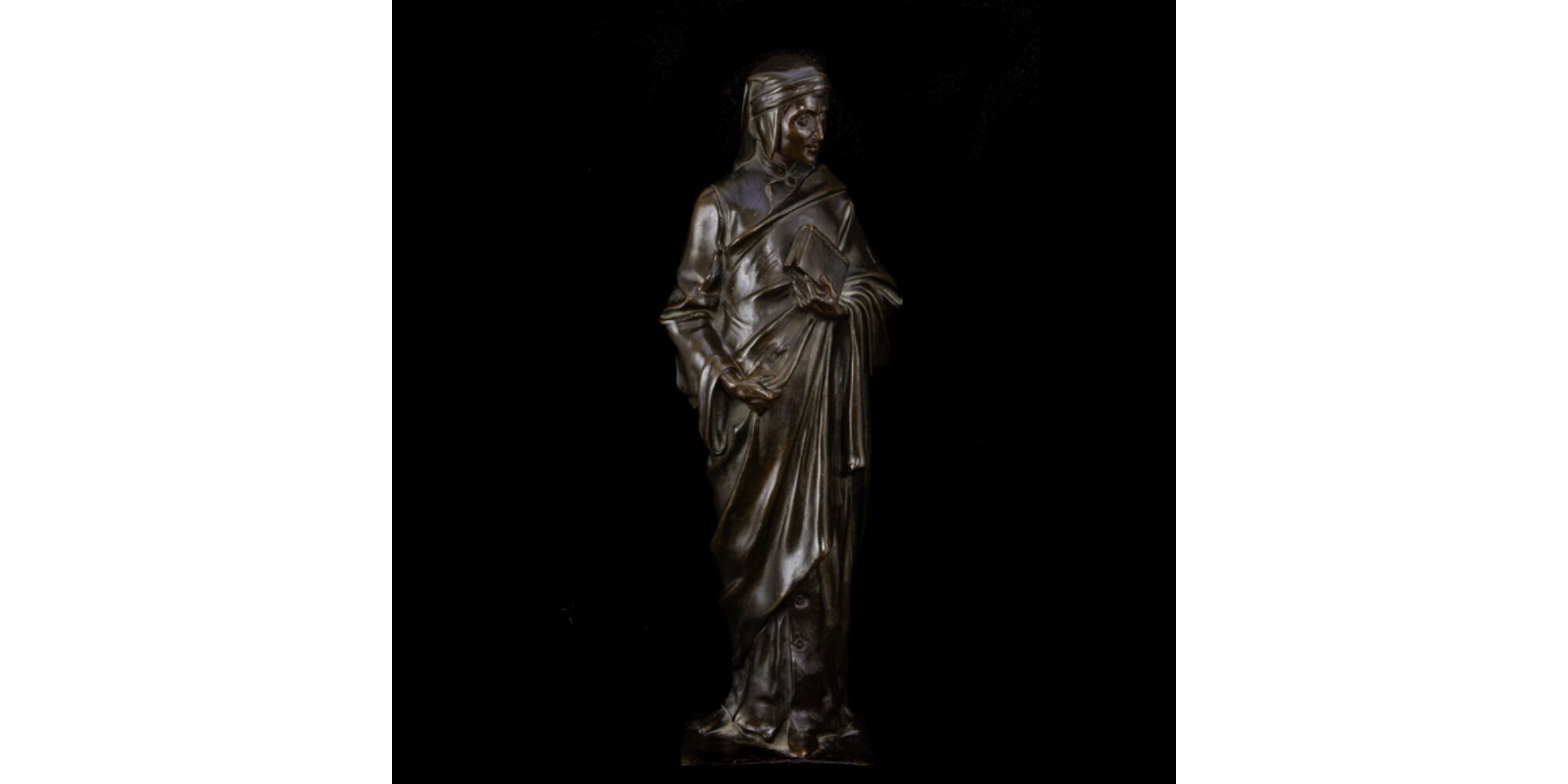Öntött, patinázott bronz Dante álló szobra. Méretei: 41 x 10 x 14 cm. Jelzés nélkül, XX. század első fele-közepe.