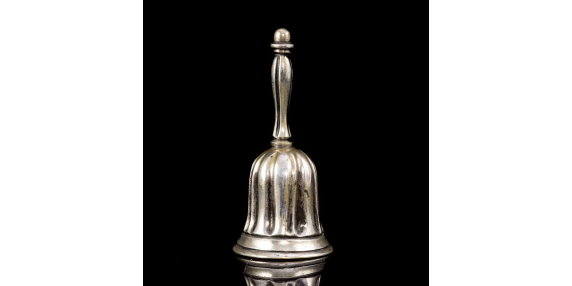 800-as finomságú, öntött ezüst kis csengő, Nettó tömege: 143,30 gramm; méretei: 10,5 x d:4,5 cm. Jelzett: 800-as finomságjelzéssel. Európa, XX. század első fele- közepe.