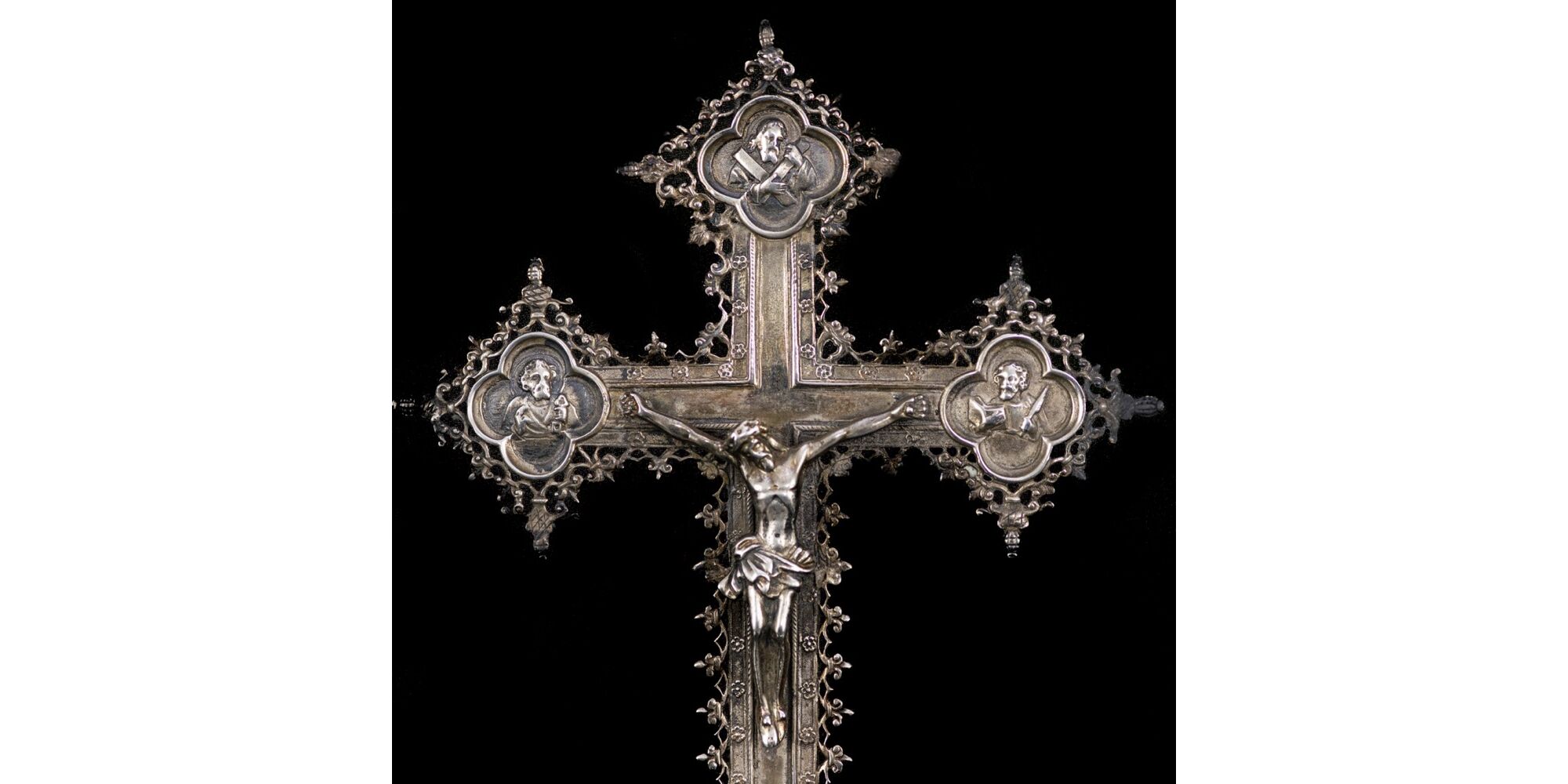 800-as finomságú ezüst, áttört szélű, öntött feszület korpusszal. A kereszt négy szárán a négy apostol képmásával. Nettó tömege:139,46 gramm, Méretei: 21 x 16 cm. XX. század első fele-közepe. Jelzett: 800-as finomságjelzéssel és feloldatlan fémjelzéssel.