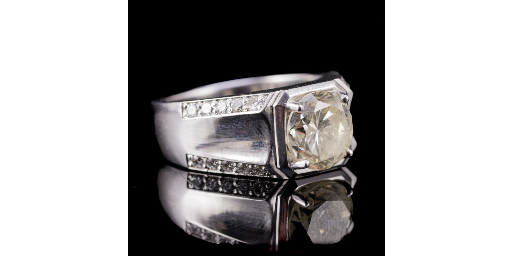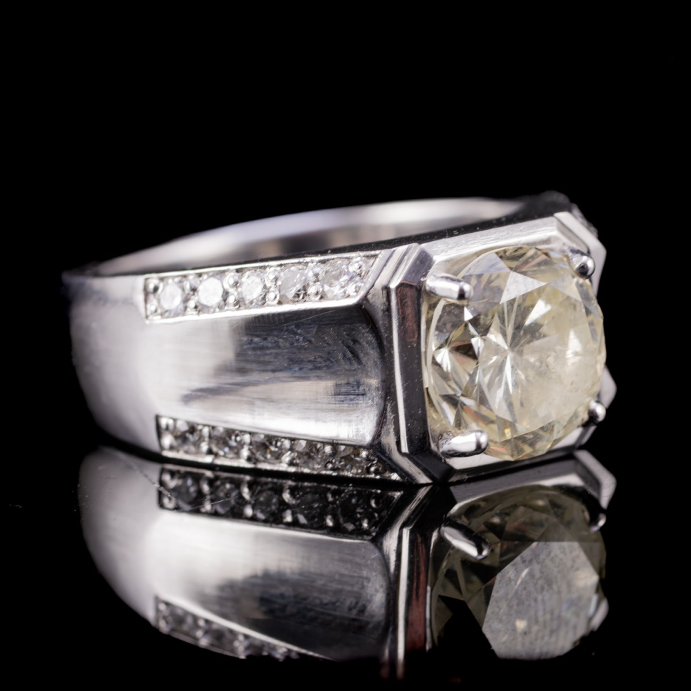 14 karátos fehérarany férfi pecsétgyűrű középen négykarmos foglalatban egy kerek, briliáns csiszolású gyémánt kővel (3.43 ct, M1, VLy (Q), P2), a gyűrűvállakon további 10-10 darab apró kerek briliáns csiszolású gyémánttal (összesen cca: 0.20ct, M1, TCr, VVs). Jelzett: 2016-tól használt belföldi, 585%. ezrelékes arany fémjellel. Bruttó: 11.93 gramm. Gyűrű mérete: 61/62.