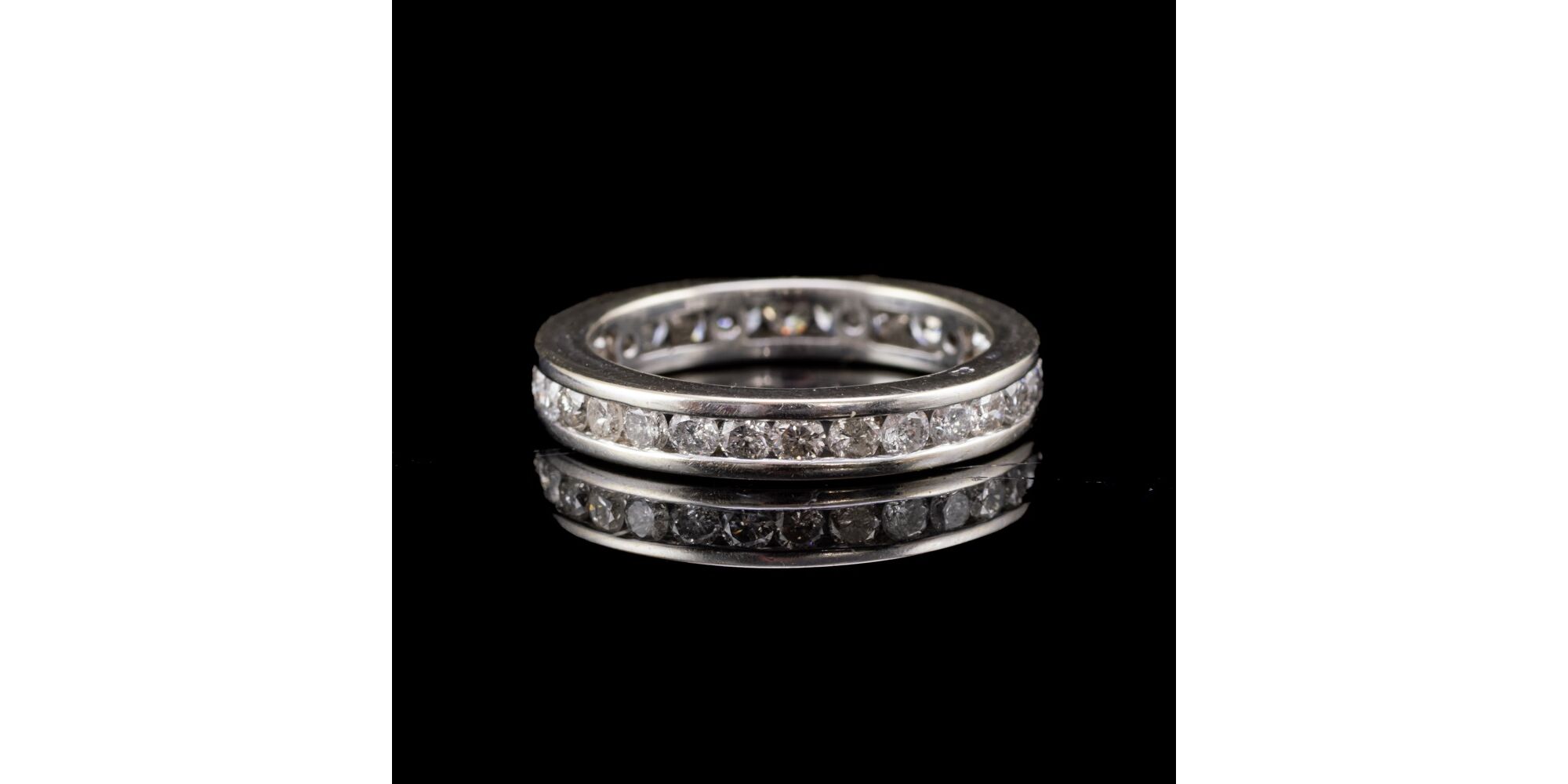 14 karátos fehérarany sportgyűrű, Bruttó tömege: 3,94 gramm. 29 darab modern briliáns csiszolású gyémánttal Cca.0,58 ct.(M1;C;/M-N; P1-P3) Jelzett: 1999 utáni behozatali fémjellel. Gyűrű mérete:55.
