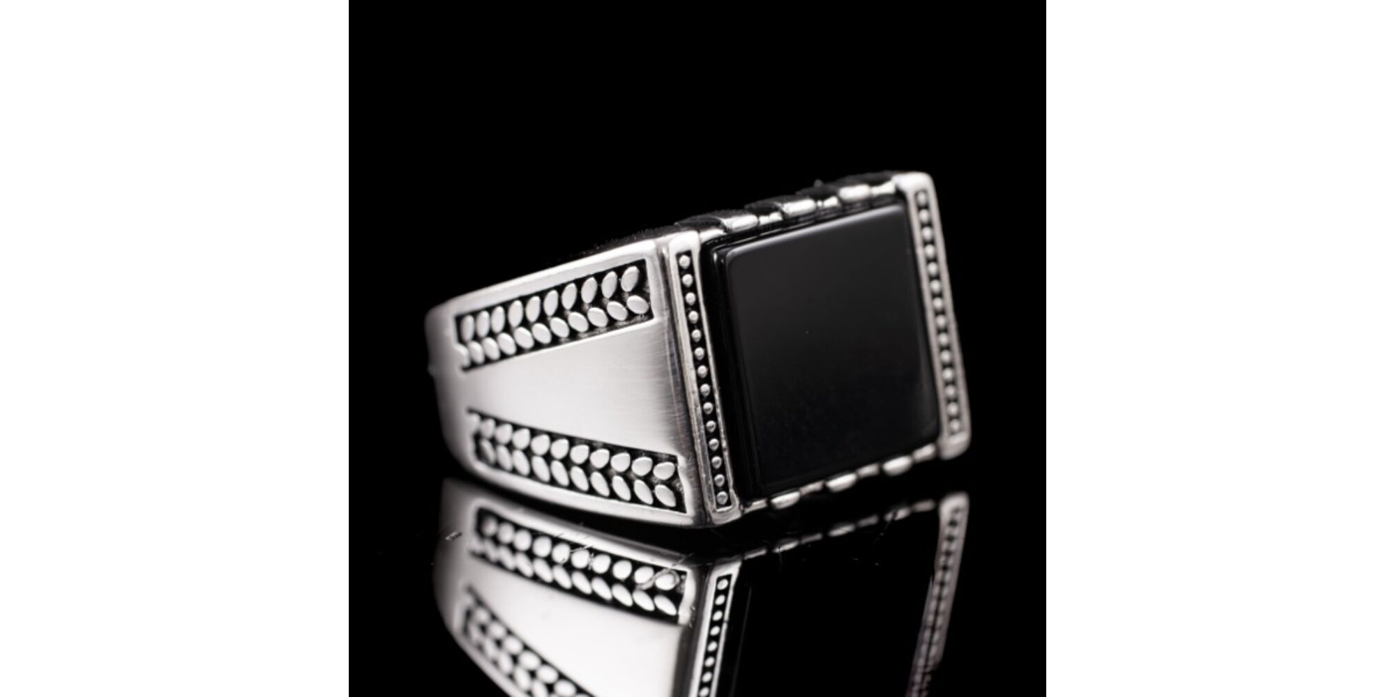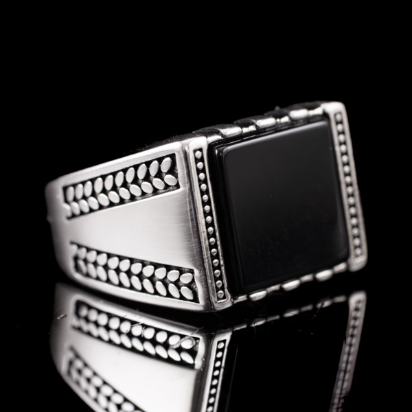 925-ös finomságú ezüst pecsétgyűrű, gyűrűfejben 1 nagyobb, négyszögletes forma fekete ónix lappal, rovátkolt és vésett gyűrűvállakkal. Bruttó tömege: 9,33 gramm. Jelzett: 2016-tól használatban lévő magyar fémjellel. Gyűrű mérete:62
