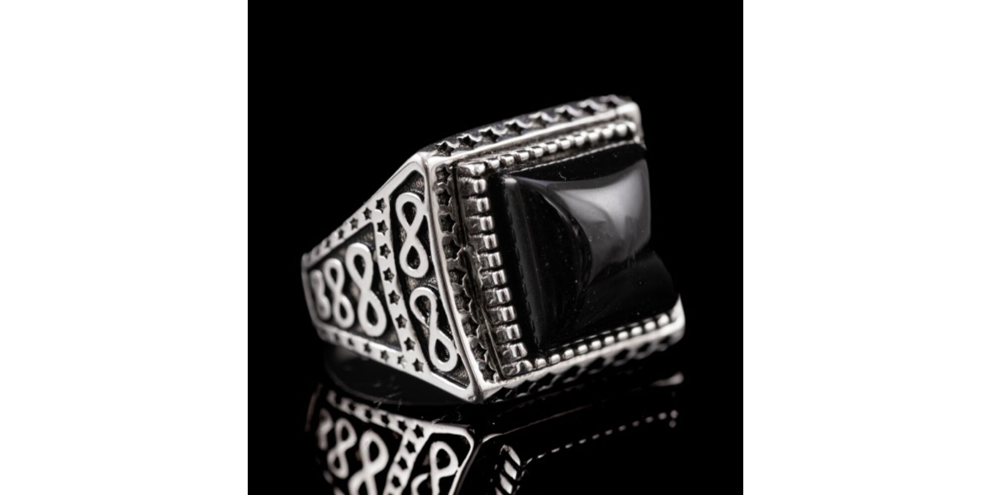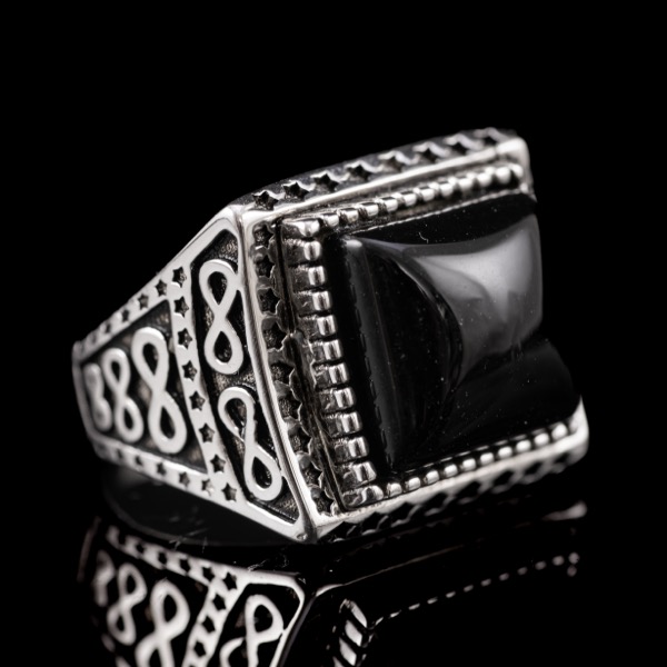 925-ös finomságú ezüst pecsétgyűrű, Bruttó tömege: 10,9 gramm. Gyűrűfejben lemezelt, zárt foglalatban 1 nagyobb, négyszögletes forma, kabochon csiszolású fekete ónix kővel, "végtelen 8-as" mintázatú gyűrűvállakkal. Jelzett: 2016-tól használatban lévő magyar fémjellel. Gyűrű mérete:60.