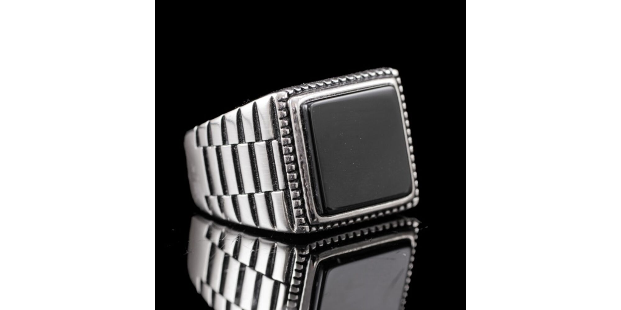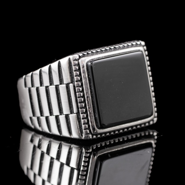 925-ös finomságú ezüst pecsétgyűrű, gyűrűfejben 1 nagyobb, négyszögletes forma fekete ónix lappal, "Rolex" stílusú rovátkolt gyűrűvállakkal. Bruttó tömege: 9,06 gramm. Jelzett: 2016-tól használatban lévő magyar fémjellel. Gyűrű mérete:60.