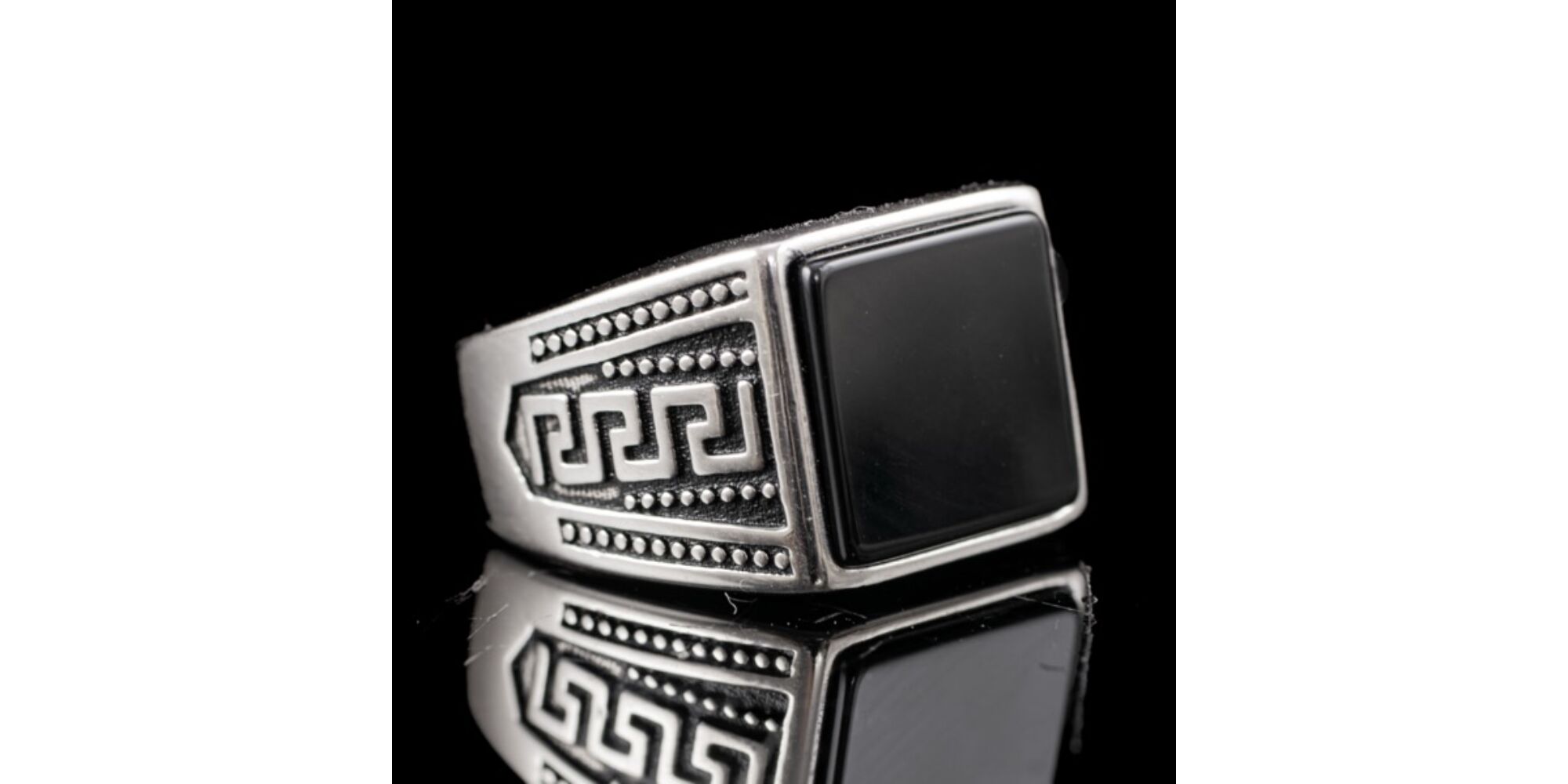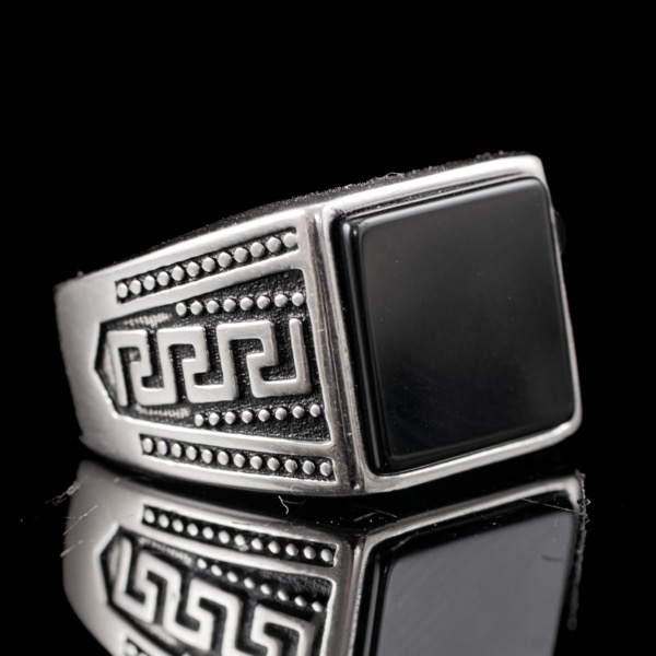 925-ös finomságú ezüst pecsétgyűrű, gyűrűfejben 1 nagyobb, négyszögletes forma fekete ónix lappal, vésett görög "futókutya" mintázatú, feket zománccal kitöltött gyűrűvállakkal. Bruttó tömege: 8,18 gramm. Jelzett: 2016-tól használatban lévő magyar fémjellel. Gyűrű mérete:63.