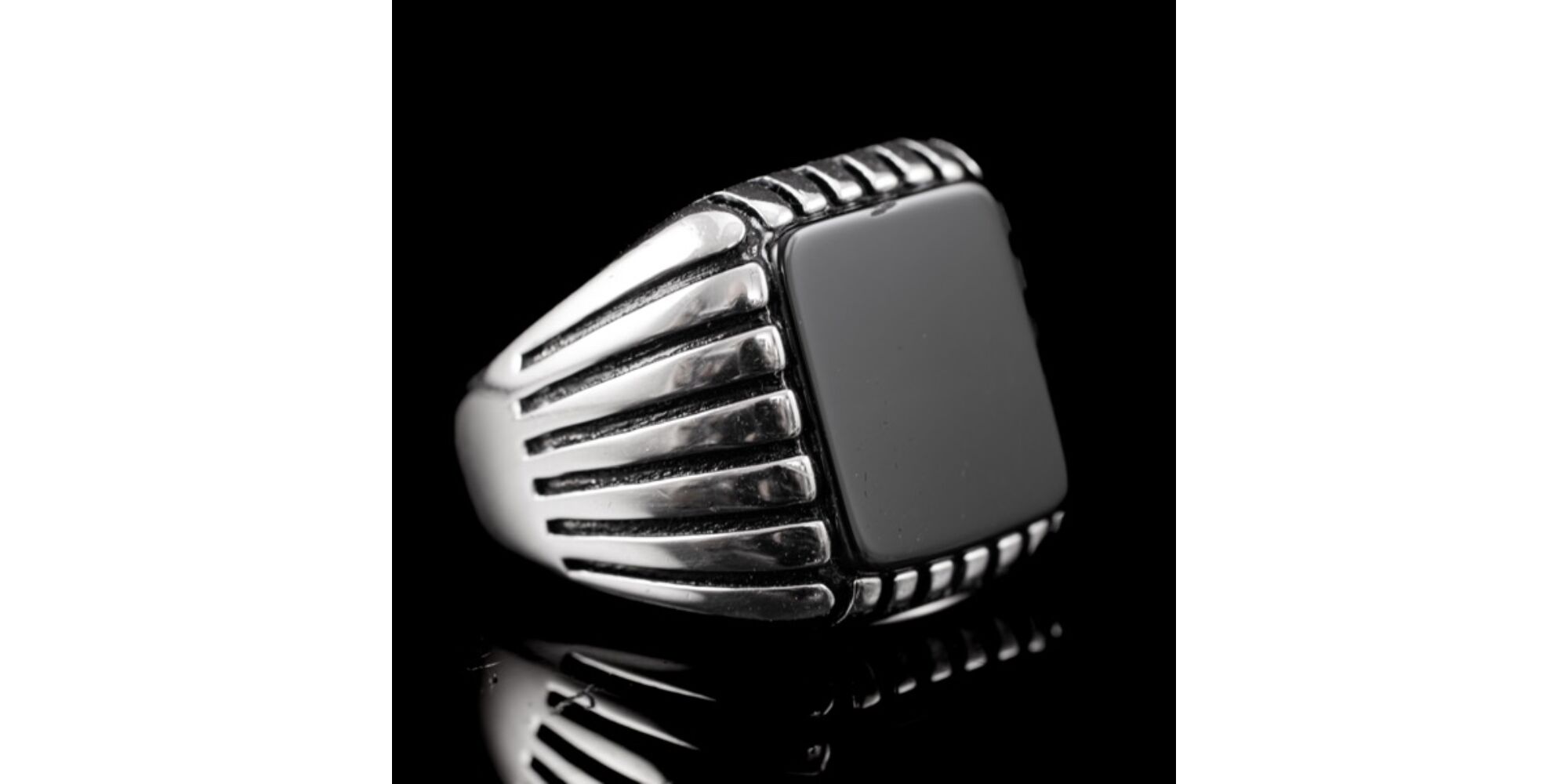 925-ös finomságú ezüst pecsétgyűrű, gyűrűfejben 1 nagyobb, négyszögletes forma fekete ónix lappal, rovátkolt gyűrűvállakkal. Bruttó tömege: 9,31 gramm. Jelzett: 2016-tól használatban lévő magyar fémjellel. Gyűrű mérete:62.