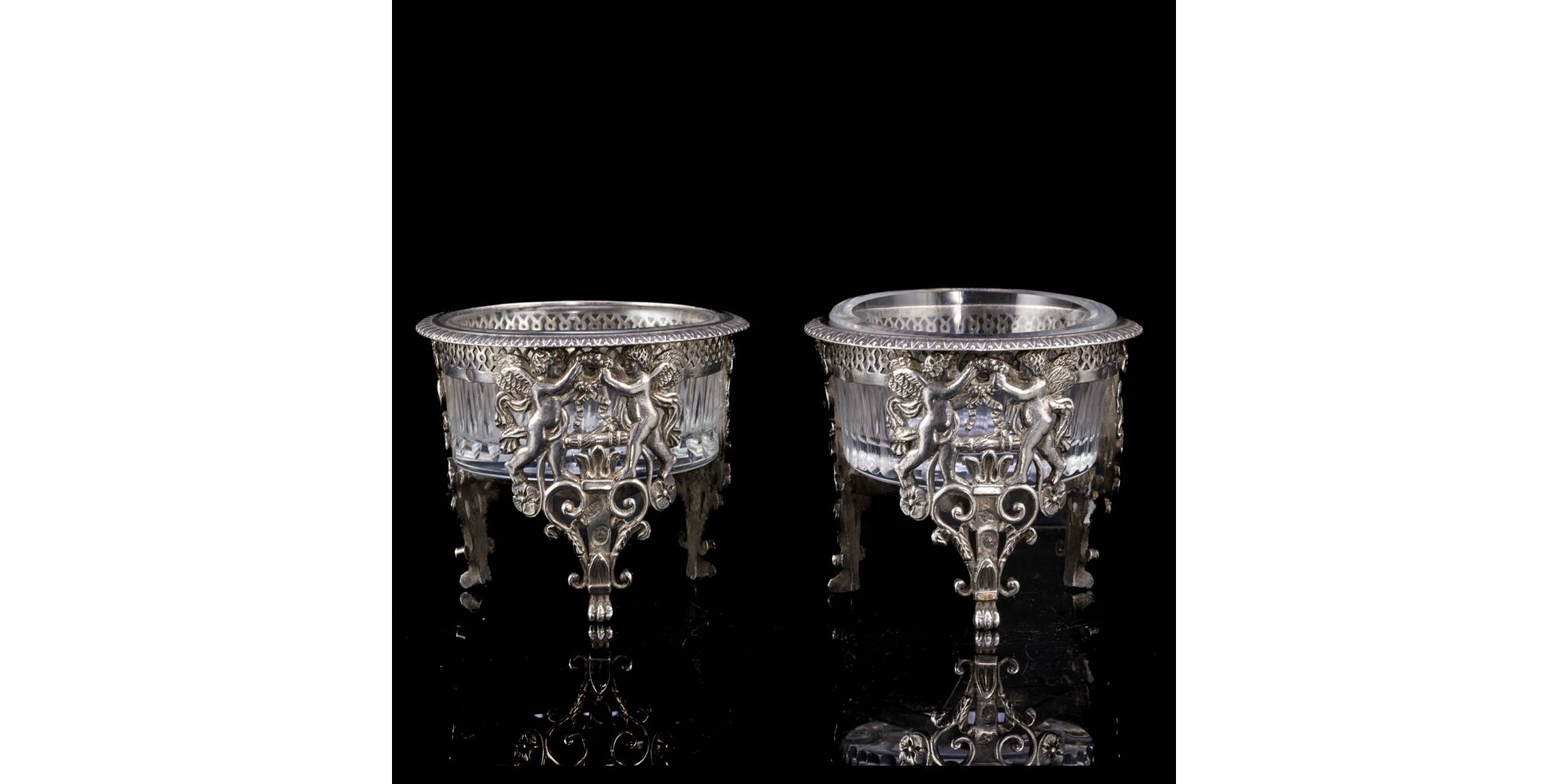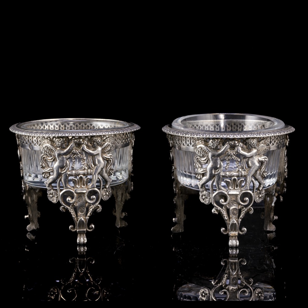 950-es finomságú, áttört ezüst, angyalpárral díszített, háromlábú fűszertartó, pótolt, hámozott mintázatú szintelen üvegbetétekkel. Méretei: 6 x d:7 cm. Nettó tömege:202,17 gramm. Jelzett:1798-1819 között használt francia fémjellel, Pierre Meurice mesterjelével.
