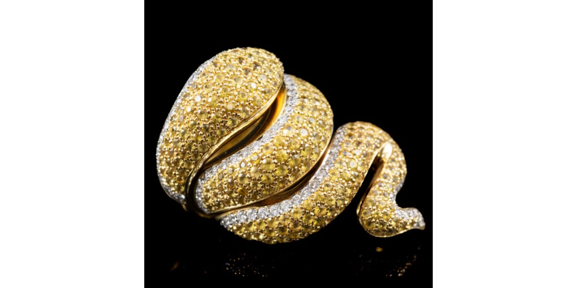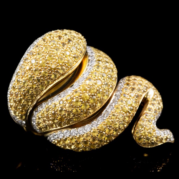 Modern olasz Design gyűrű sárga zafír kövekkel kirakott kígyó formájú gyűrűfejjel. 18 karátos fehérarany, Bruttó tömege:36,09 gramm. 307 foglalt, kerek formára fazettált sárga zafírral Cca.6,14 ct; és 93 modern briliáns csiszolású gyémánt ékítéssel Cca.1,4 ct. (M1;Tcr; Vs) Jelzett: 1968-tól napjainkig használatban lévő olasz fémjellel. Gyűrű mérete: 55-56.