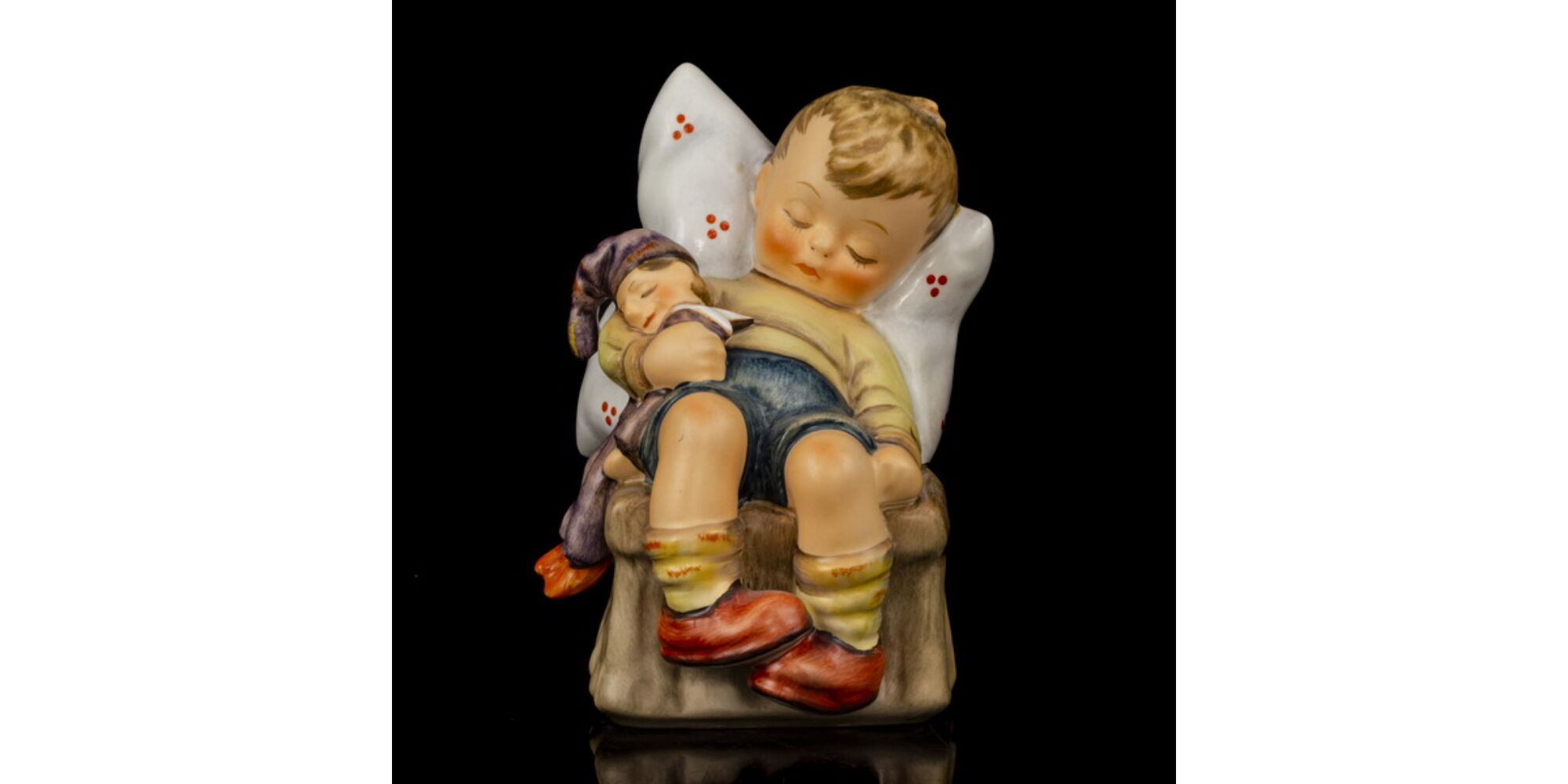Részben mázas, festett Goebel porcelán figura, "Csak egy negyedórára szunyókáló" kisfiú figura. Méretei: 11 x 7,5 x 9 cm. Jelzett: 1990-99 közötti Goebel márkajelzéssel, 451-es formaszámmal.