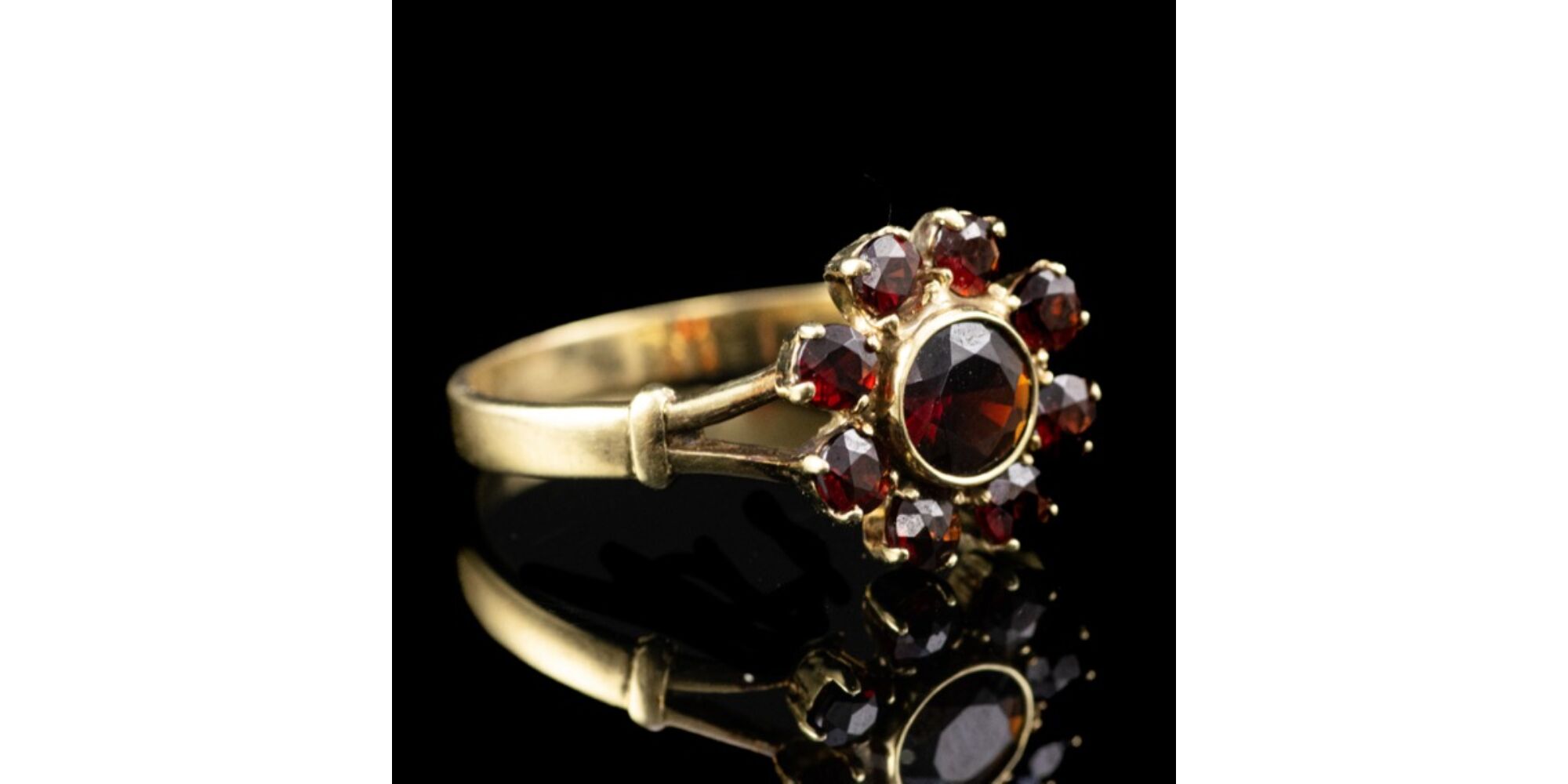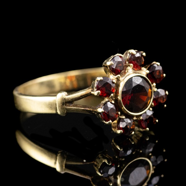 14 karátos arany gyűrűsín, Bruttó tömege: 3,7 gramm. Rozetta fazonú gyűrűfejben 1 nagyobb, arannyal lemezelt, zárt foglalatban és körülötte 8 kisebb, karmos foglalású, kerek formára fazettált gránát kővel Összesen: Cca. 1,55 ct. Jelzett: 585-ös finomságjellel. Gyűrű mérete: 63.