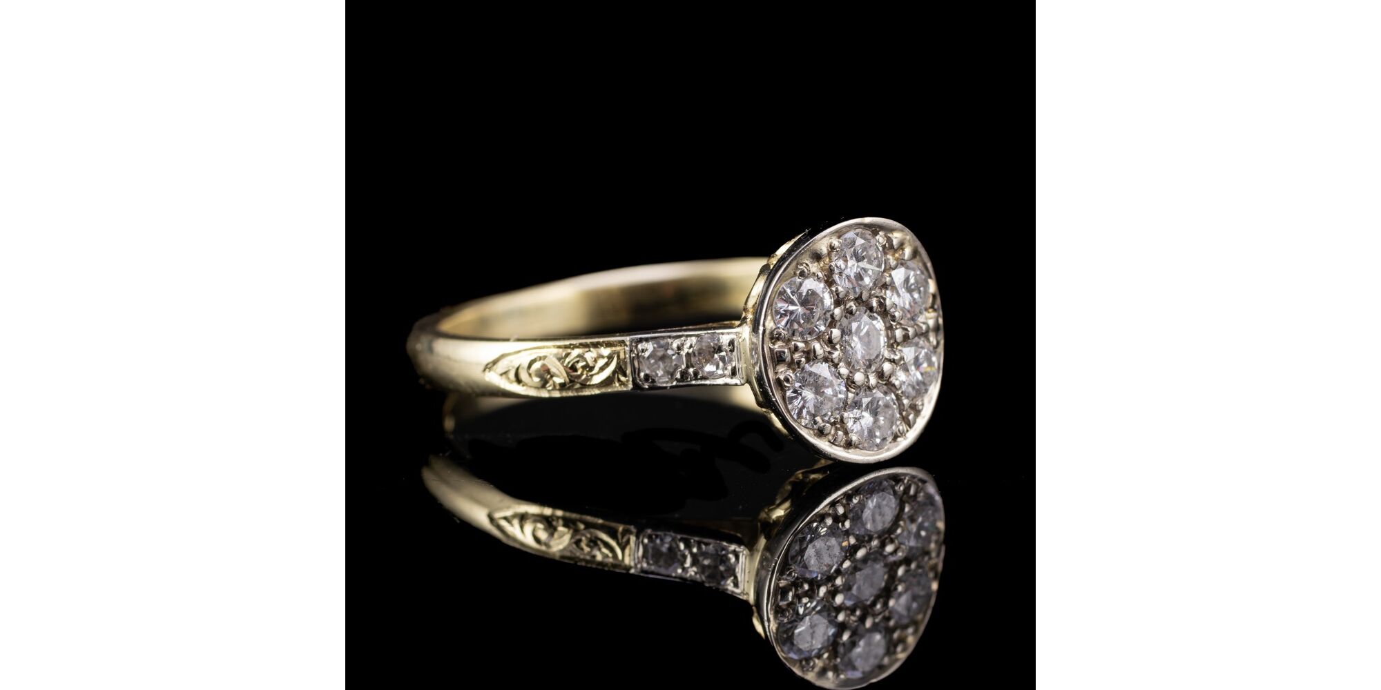 14 karátos női arany gyűrű, kerek, ezüst gyűrűfejben 7 darab briliáns csiszolású gyémánt kővel (összesen cca: 0.70 ct, M1, TCr (I-J), Vs), a gyűrűvállakon további 2-2 achtkant-csiszolású gyémánttal (összesen cca: 0.12 ct). Jelzett: 2016-tól használt belföldi, 585%.ezrelékes arany fémjellel. Bruttó: 3.34 gramm. Gyűrű mérete: 54.