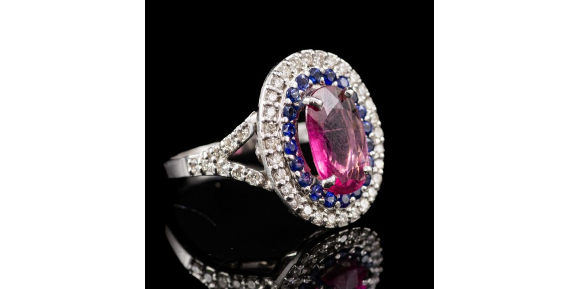 18 karátos fehérarany gyűrűsín, Bruttó tömege: 5,86 gramm. Rozetta fazonú gyűrűfej közepében 1 nagyobb, ovál formára fazettált pinkes rózsaszín turmalin Cca. 3 ct. körülötte 20 apró, kék zafír Cca. 0,20 ct; körben 30 apró briliáns csiszolású gyémánt, valamint gyűrűvállakon 8-8 briliáns csiszolású gyémánt, amelyek mindösszesen Cca.0,46 ct. Jelzett: 750-es finomságjelzéssel, valamint francia (Párizs) 1893-tól napjainkig használt import jellel. Gyűrű mérete: 54.