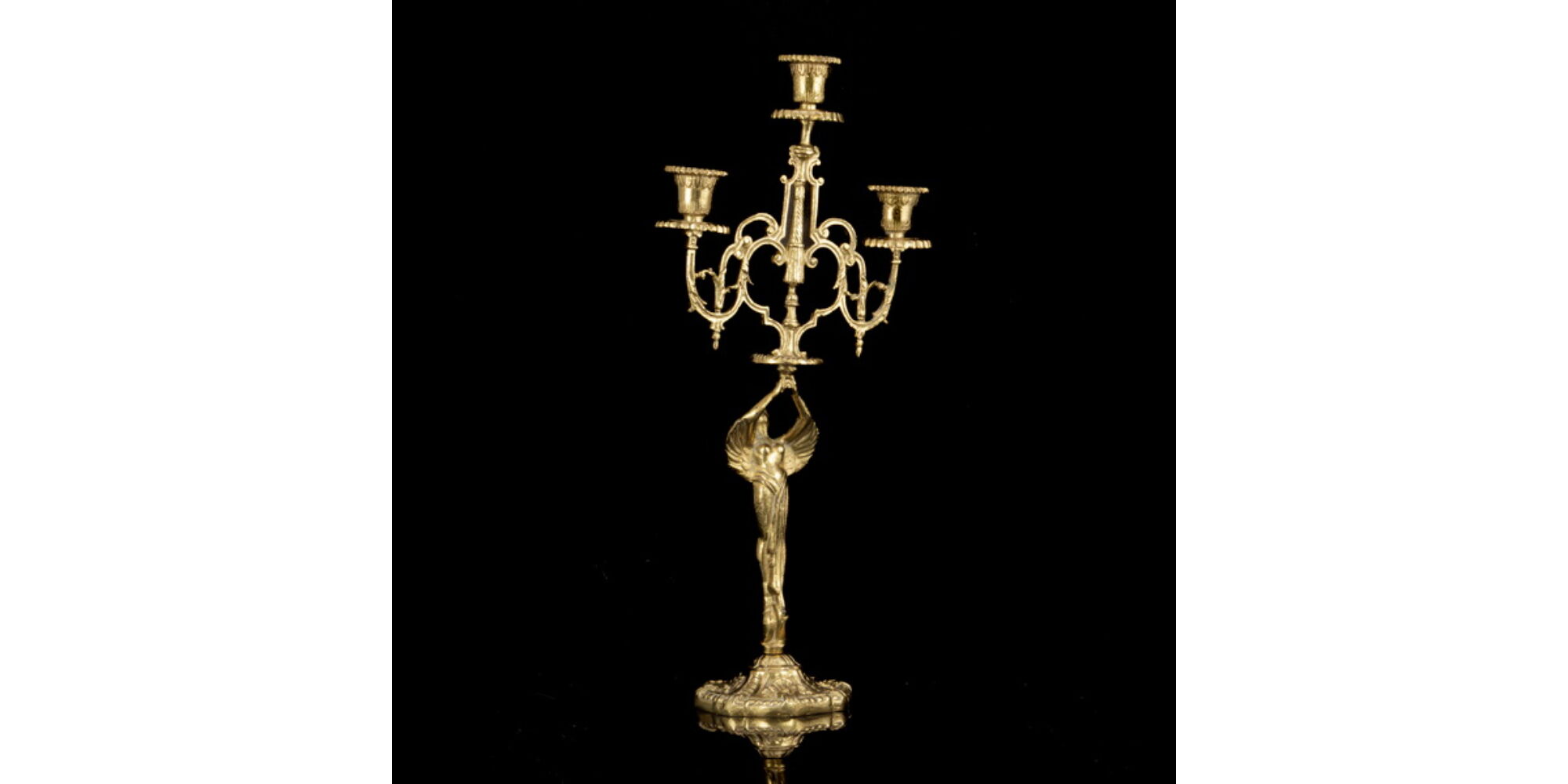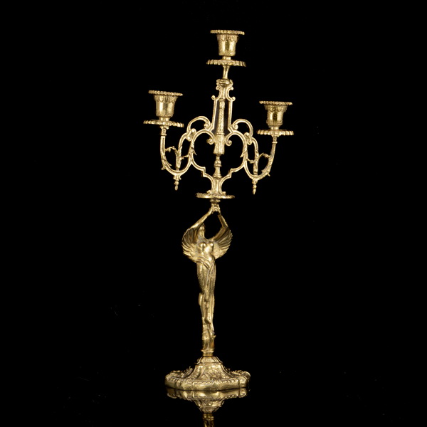 Cast brass, 3-armed, figural candlestick. Dimensions: 41 x 19 x 10 cm. Unmarked, second half of the 20th century.