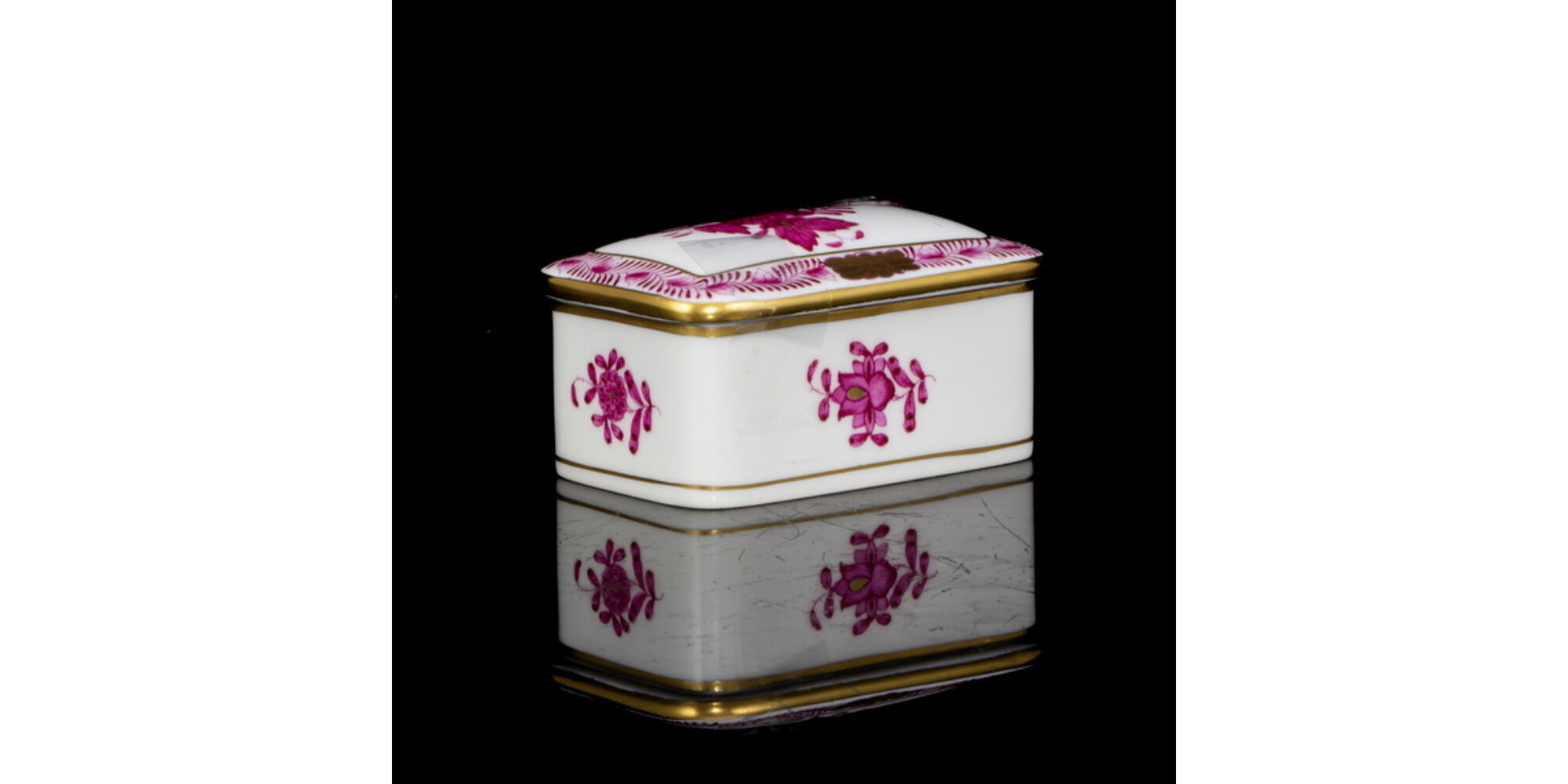Téglatest formájú Herendi porcelán fedeles dobozka, pink Apponyi dekorral, aranykontúrozással. Méretei: 4 x 7,5 x 5 cm. Jelzett: XX. század második fele Herendi márkajelzéssel, 7876/AP formaszámmal.