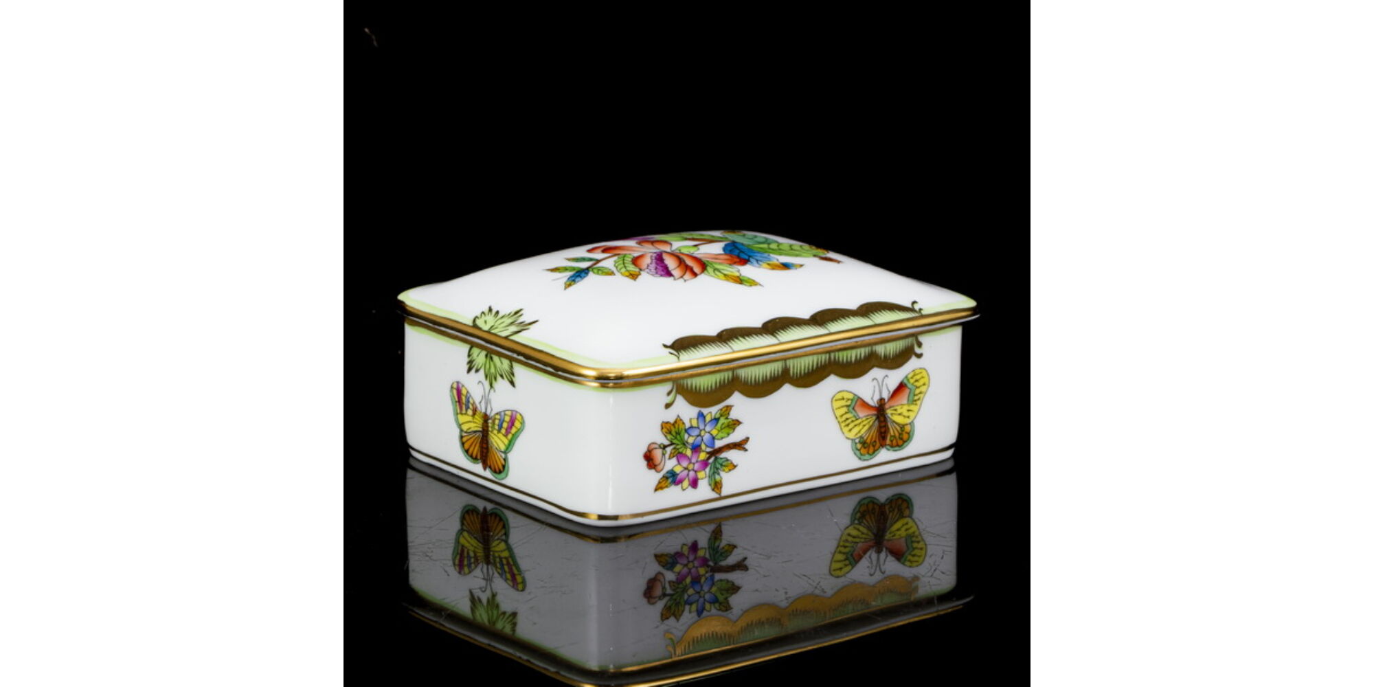 VBO Viktória dekorral festett, mázas Herendi porcelán doboz. Méretei: 4,5 x 10 x 8 cm. Jelzett: XX. század II. fele Herendi márkajelzéssel, 7973/VBO formaszámmal.