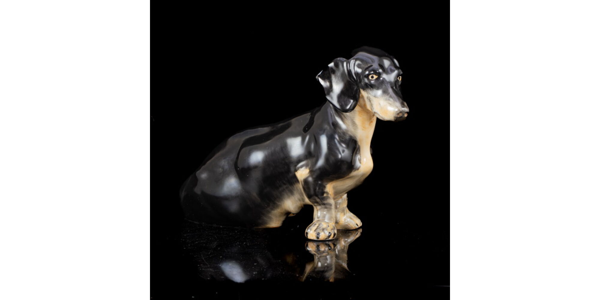 Painted, glazed Herend porcelain Dachshund figurine, dimensions: 13.5 x 23 x 9 cm. Marked: blue Herend branding mark and Herend mold number 5320 pressed into the mass.