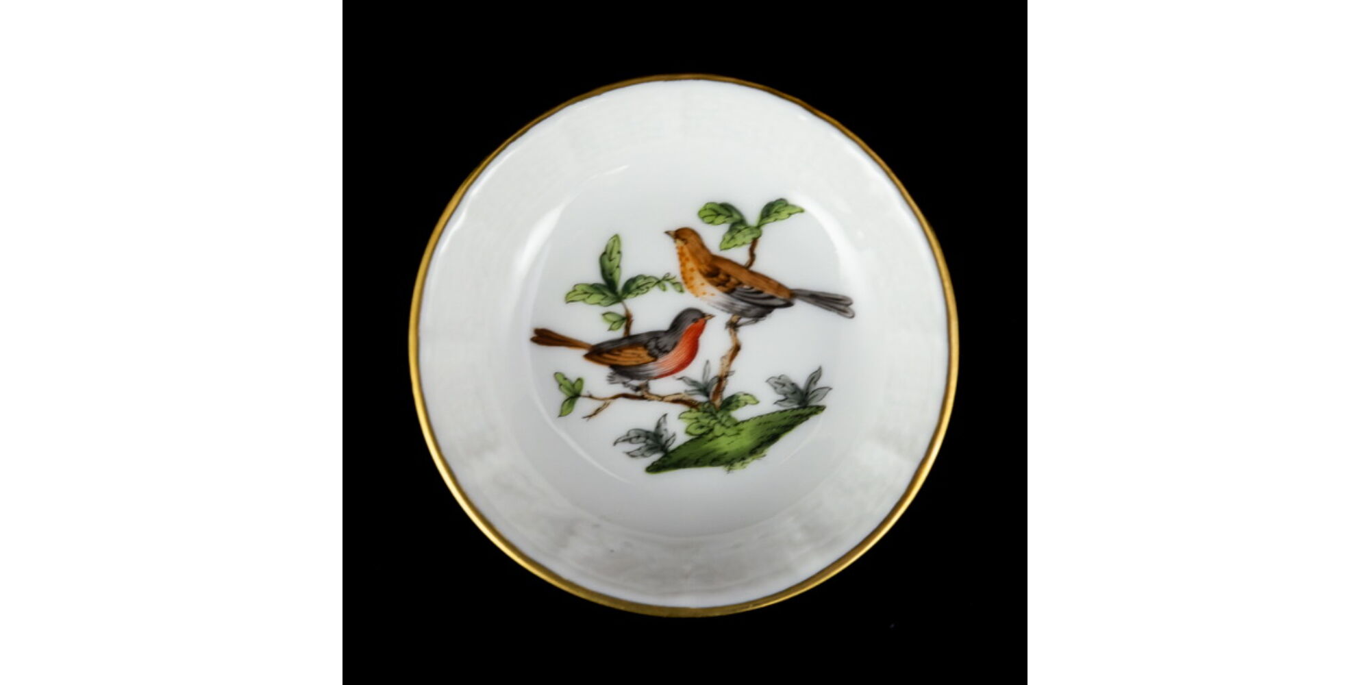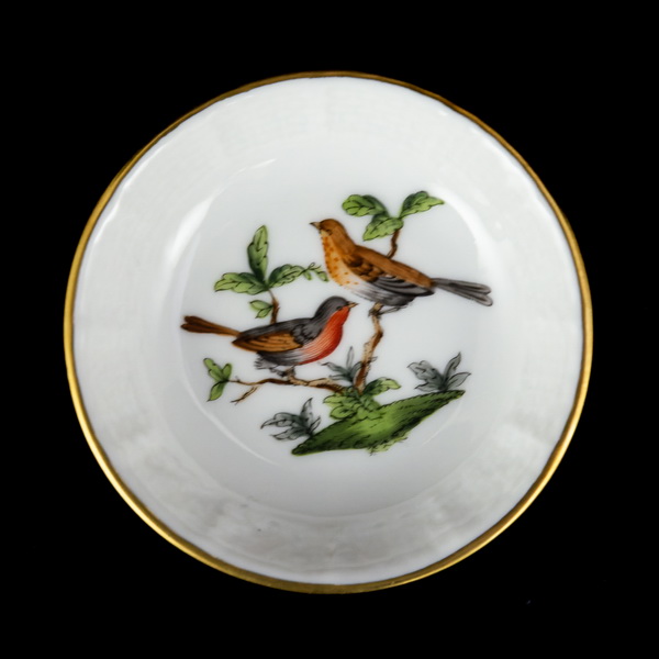 Rotschild dekorral festett, aranykontúrozott RO Rotschild mintás kistálka, mérete: d:7 cm. Jelzett: XX. század második fele Herendi márkajelzéssel, 681/RO formaszámmal.