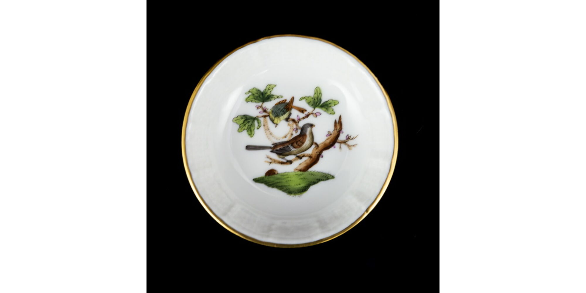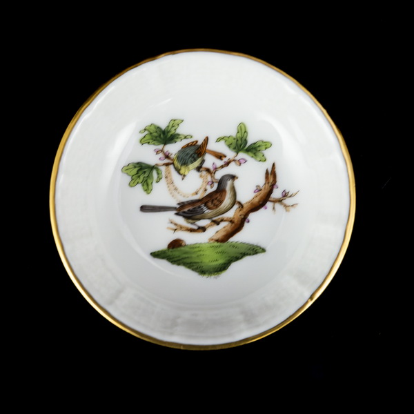Rotschild dekorral festett, aranykontúrozott RO Rotschild mintás kistálka, mérete: d:7 cm. Jelzett: XX. század második fele Herendi márkajelzéssel, 681/RO formaszámmal.