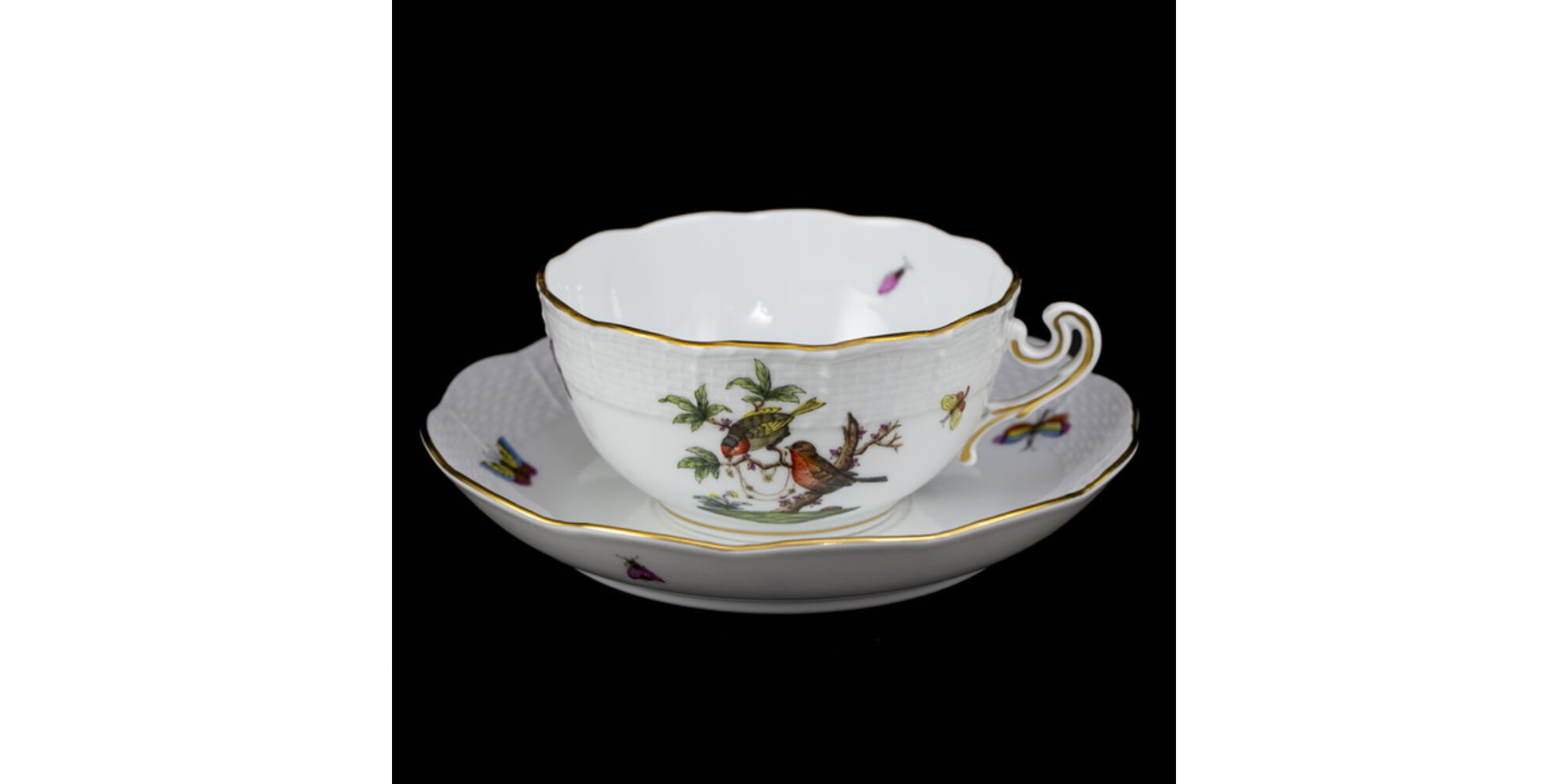 Rotschild (RO) dekorral festett, mázas Herendi porcelán teáscsésze és alj. Méretei:d:16,5 cm. Jelzett: XX. század második fele Herendi márkajelzéssel és 702/RO illetve 733-as formaszámmal.