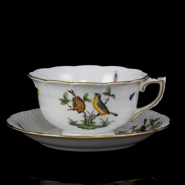 Rotschild dekorral festett, mázas, aranykontúrozott Herendi porcelán teáscsésze és alj. Méretei: d:15,5 cm. Jelzett: XX. század második fele Herendi márkajelzéssel, valamint 733RO formaszámmal.