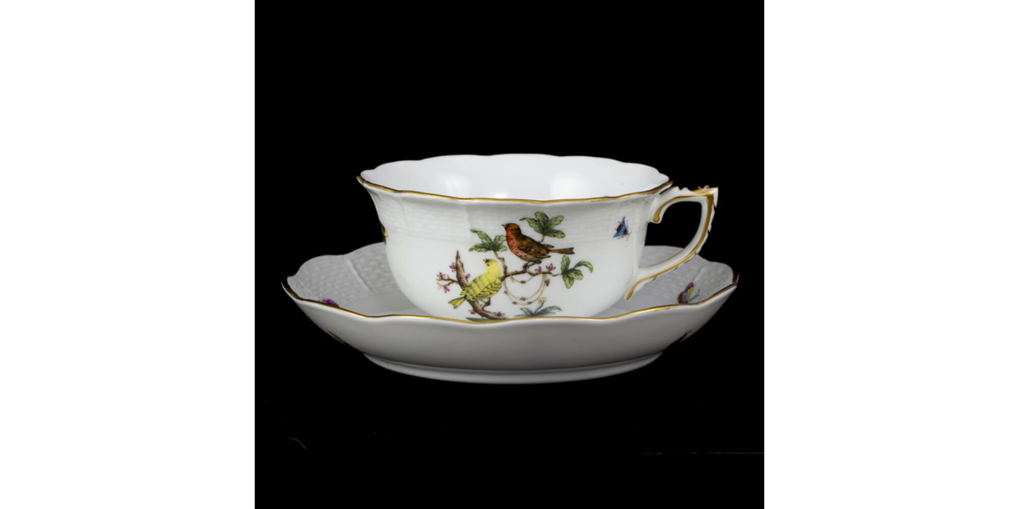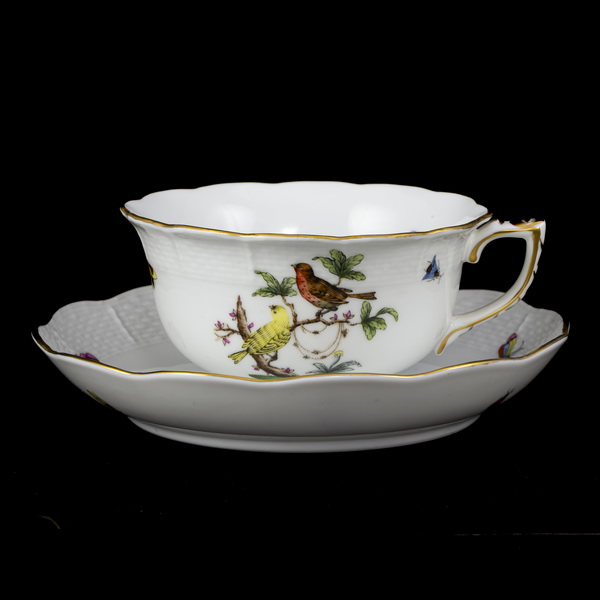 Rotschild dekorral festett, mázas, aranykontúrozott Herendi porcelán teáscsésze és alj. Méretei: d:15,5 cm. Jelzett: XX. század második fele Herendi márkajelzéssel, valamint 733RO formaszámmal.