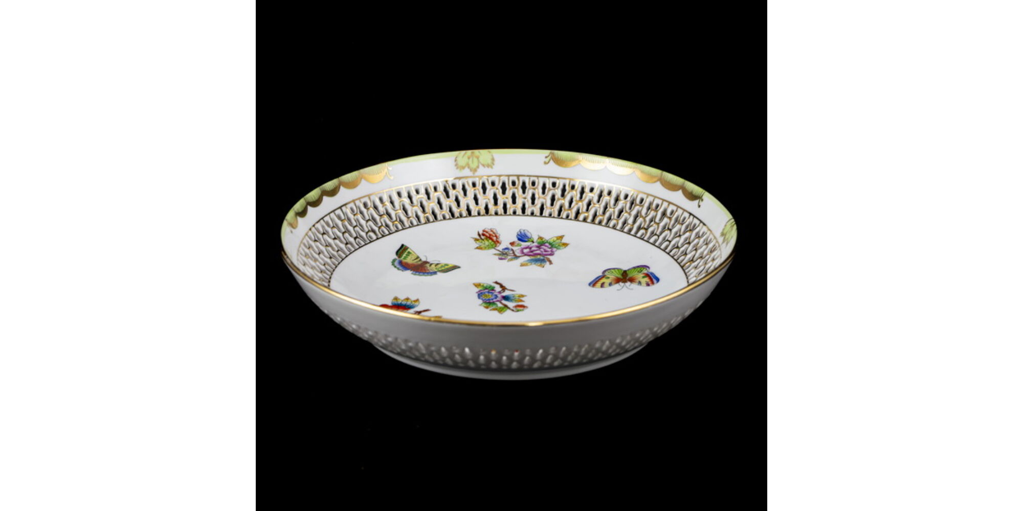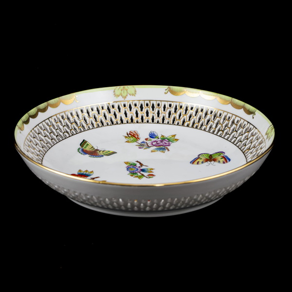 Viktória dekorral festett, mázas, áttört peremű Herendi porcelán kínálótál/dísztál. Méretei: 5 x d:24,5 cm. Jelzett: XX. század II. fele Herendi márkajelzéssel, 7501 formaszámmal.