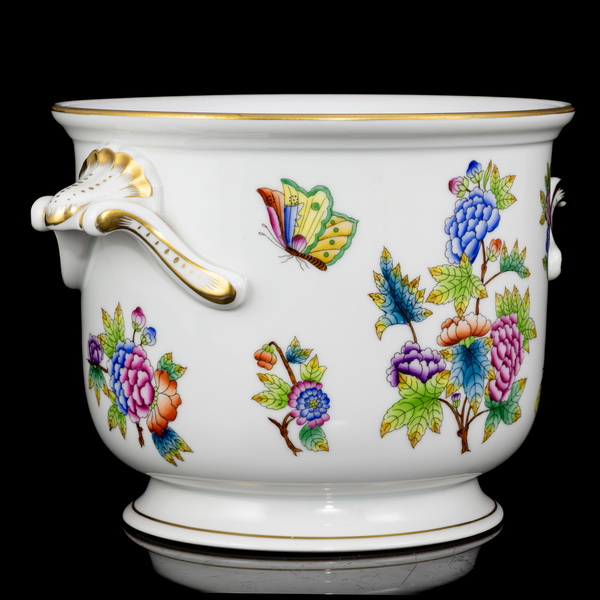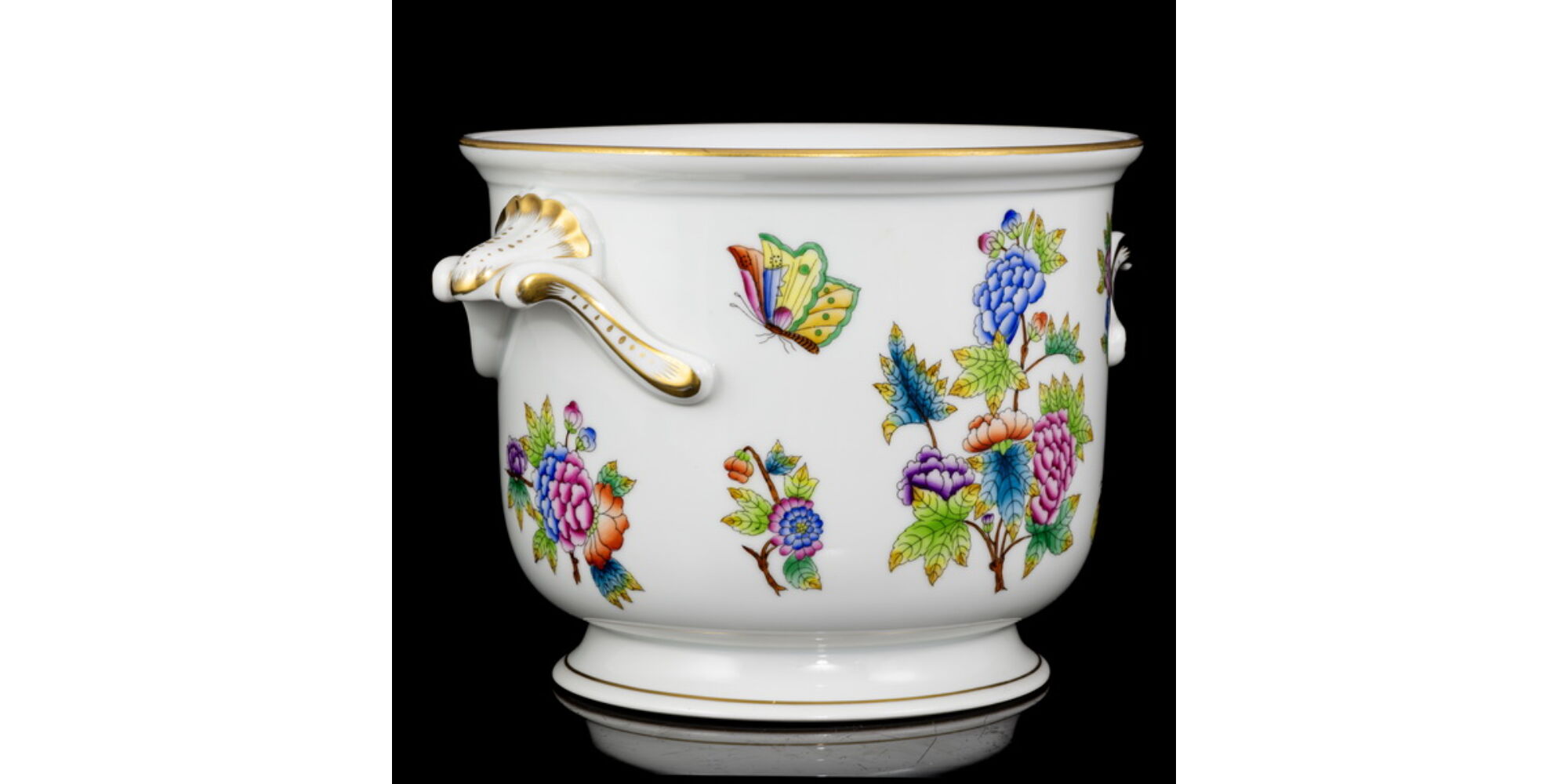 Viktória dekorral festett, mázas Herendi porceclán kaspó két füllel. Méretei: 16 x 24,5 dd:19,5 cm. Jelzett: XX. század második fele Herendi márkajelzéssel valamint 7212 VBO formaszámmal.