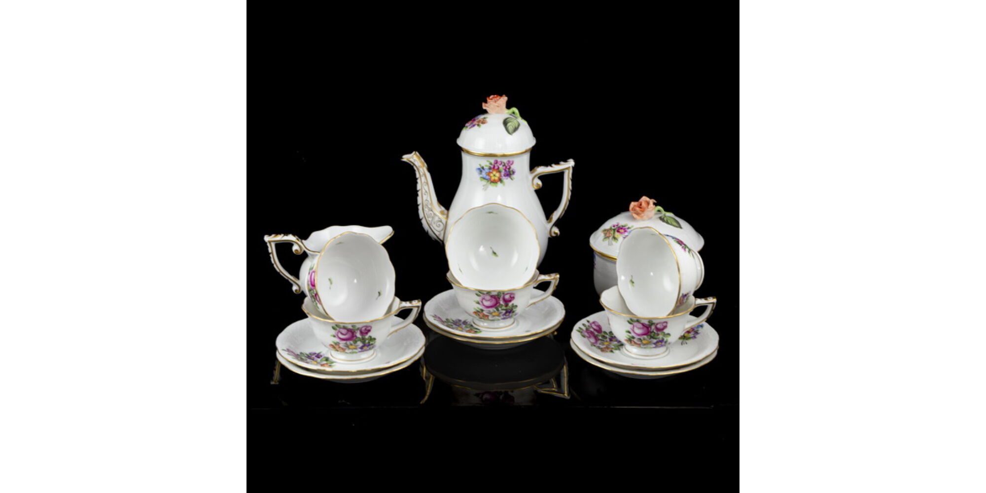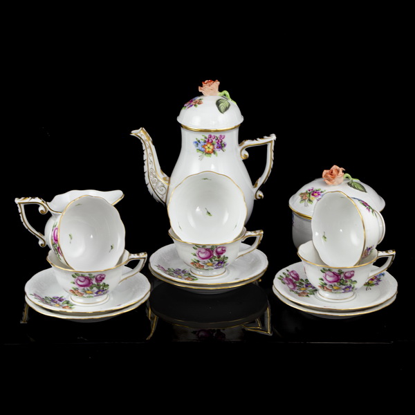 Virágmintával festett, mázas Herendi porcelán kávéskészlet (6 személyes). Tartalmaz: Kávéskanna fedelével, cukortartó fedelével, tejszínkiöntő, valamint 6 kávéscsésze és alj. Jelzett: 1976-os (150 éves jubileumi) kiadás. Kiöntő és cukortartó fedelének rózsája apró csorbulással.
