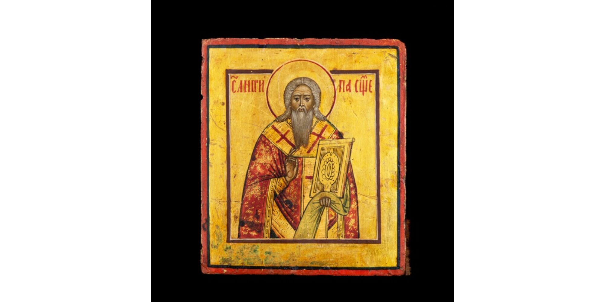 Small Russian icon painted on a wooden board with an Orthodox saint depicted on a gilded background. Oil, wood. Size: 11.5x10 cm. End of the 19th century, Russia.