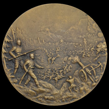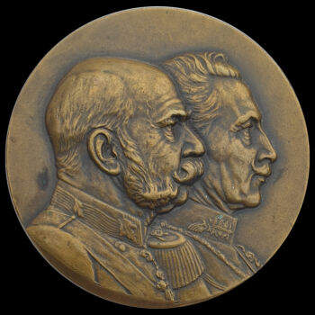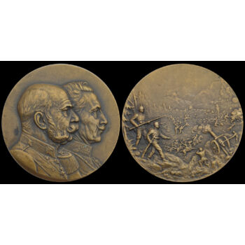Kétoldalas bronz emlékérem a Limanovai csata emlékére Ferenc József és Vilmos császár plasztikus portréjával. 1914-1915. Átmérője: 50 mm. EF! Patinával.