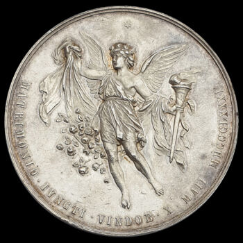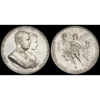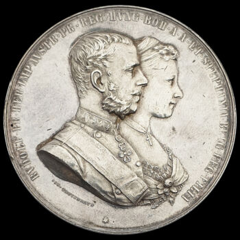 Ezüst emlékérem Rudolf koronaherceg és Stefánia belga királyi hercegnő házasságának emlékére. Bécs, 1881. Josef Tautenhayn készítői jelzéssel. Átmérője: 55 mm. Tömege: 81.7 gramm. Nagyméretű, dekoratív, plasztikus érem, peremhibával, karcokkal. Előlap: RVDOLF PR HER IMP AVSTR PR REG HVNG BOH A A ET STEPHANIA BELG REG FILIA Hátlap: MATRIMONIO IVNCTI VINDOB X MAII MDCCCLXXXI |