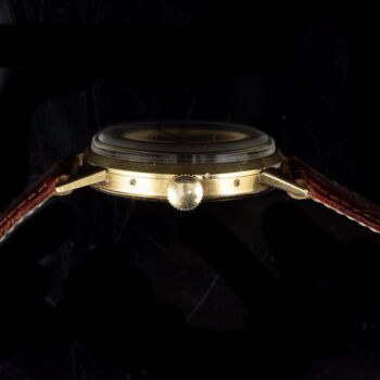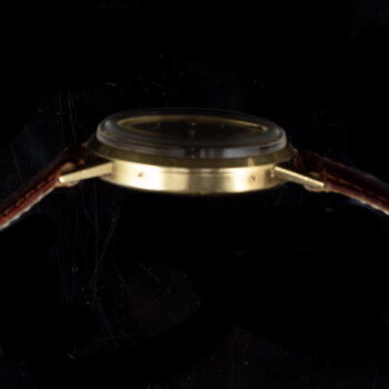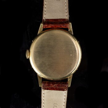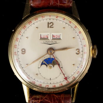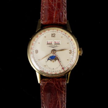 | 18 karátos arany tokban svájci, mechanikus szerkezettel, centrál mutatós, holdfázisos, naptárkijelzős, percbeosztásos, arany indexes arabszámos számlappal, piros színű dátum jelző mutatóval. Óratok mérete: d:33 mm. Szép álpotban. Svájc, 1934 utáni arany fémjellel. Működik. | |