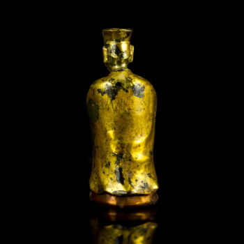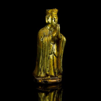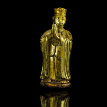 Gold-plated, varnished, carved wooden Buddhist monk figurine with hands locked in prayer. End of XIXth century. Tibet. Height: 16 cm.