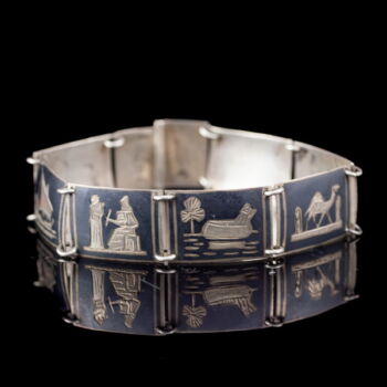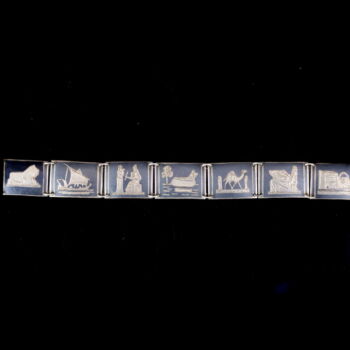| 7 nagyobb és 2 kisebb niellós vésett díszítésű ezüst lapokból fűzött karkötő vésett közel-keleti életképekkel. Hossza:19 cm, szélessége: 1,5 cm. Nettó tömege: 16,29gramm. Jelzett: feloldatlan fémjelekkel. XX. század közepe. | |
