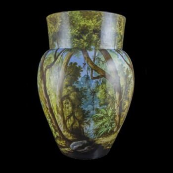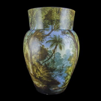 Creil et Montereau French painted porcelain floor vase with a surrounding forest landscape on its mantle. Beginning of XXth century. Height: 49 cm, diameter: 34 cm.